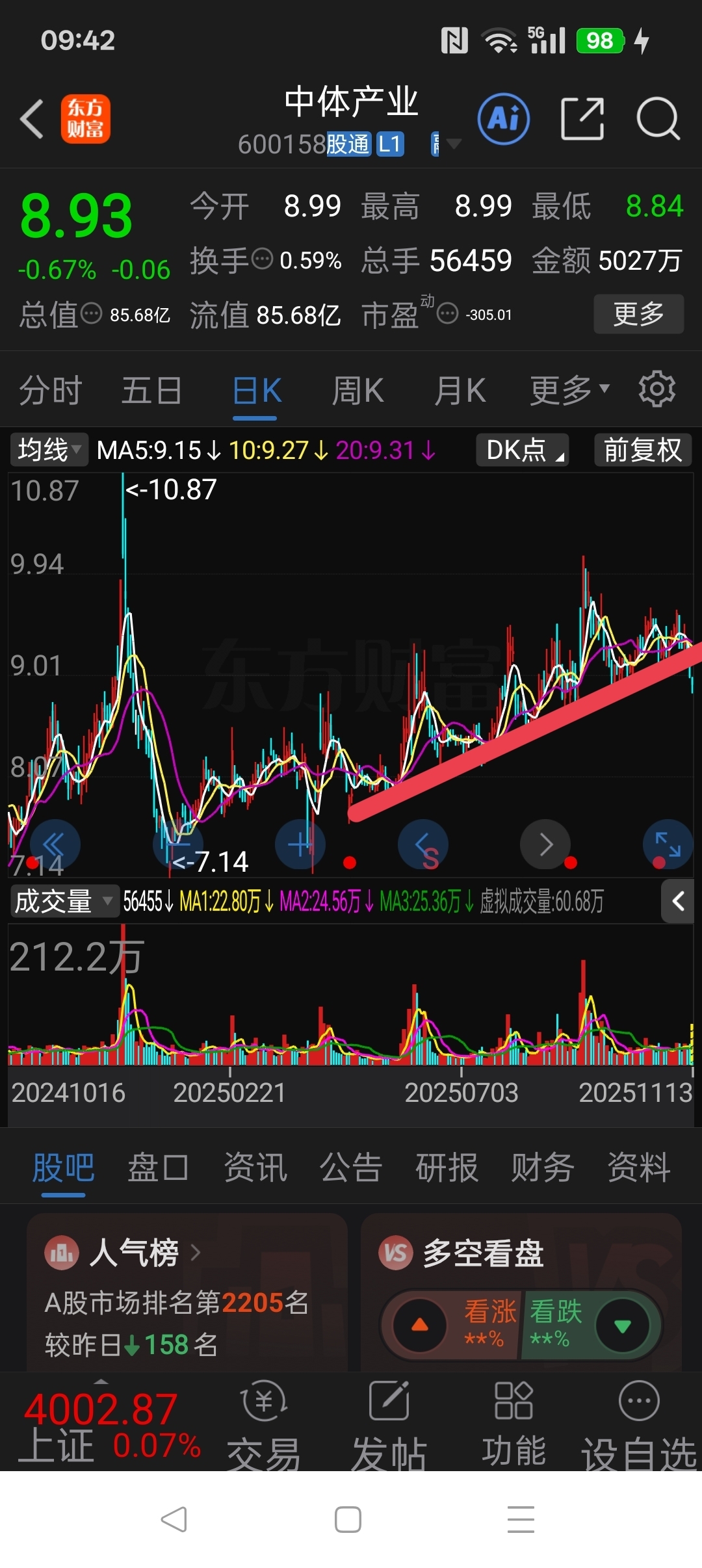 整个趋势已经破位,短期,中期都不会有任何行情。而且你们要看清楚大盘周线本周还是上涨的。也就是说中体这种逆势大跌,实际上是在整个环境仍然上涨的前提下进行的。这种调整绝对是漫长的。
