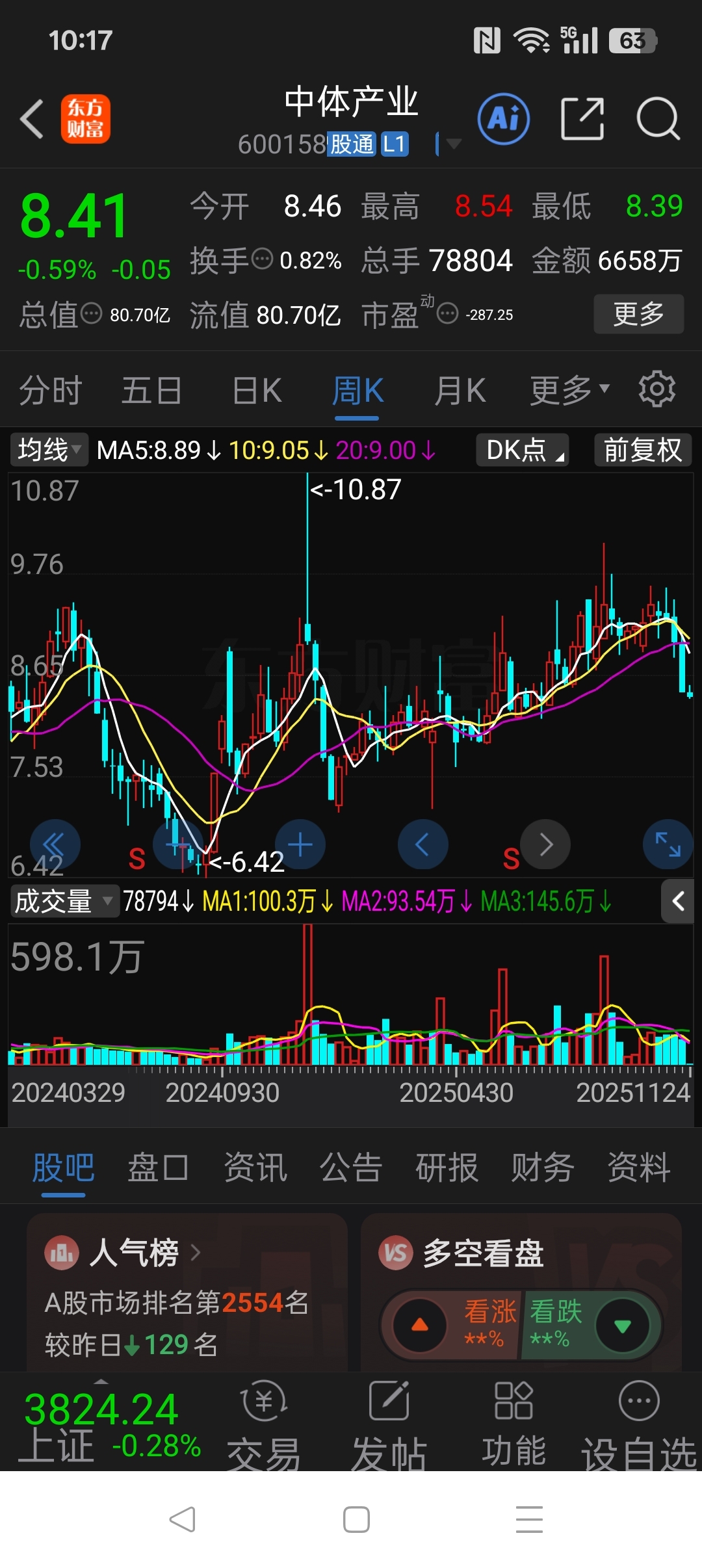今天大盘微跌但实际上是普涨格局中体仍然能够创新低就表示他本身就很弱去年10.87是一个未来几年的高点今年10.10周线彻底破位又会形成一个未来1~2年的高点也就是中体本轮跌下来反弹幅度最多也就回到9块钱左右。