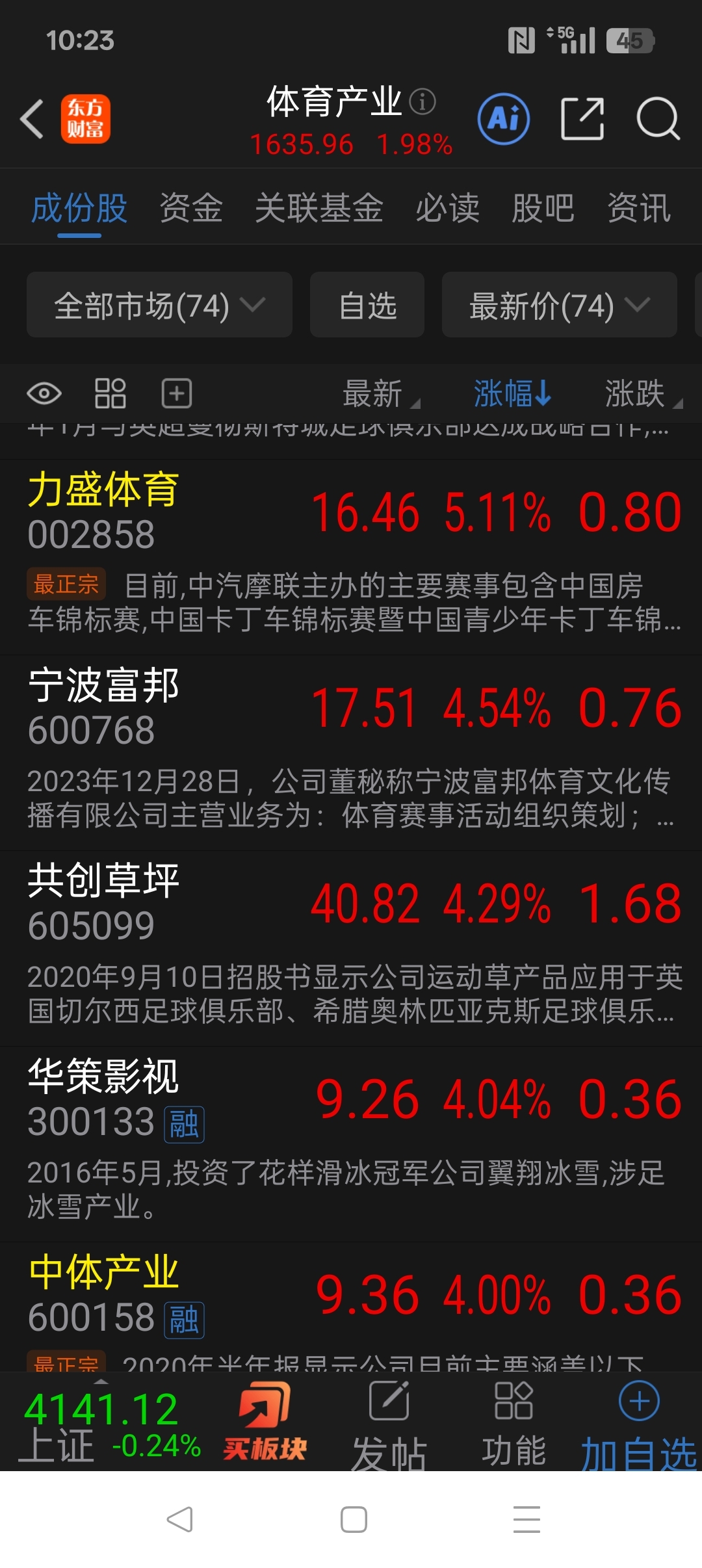 别看中体反弹了四个点,其实又是体育板块里面最弱的。赛马消息一出来,人家七八个拉涨停板,然后其他的都比中体涨得多。