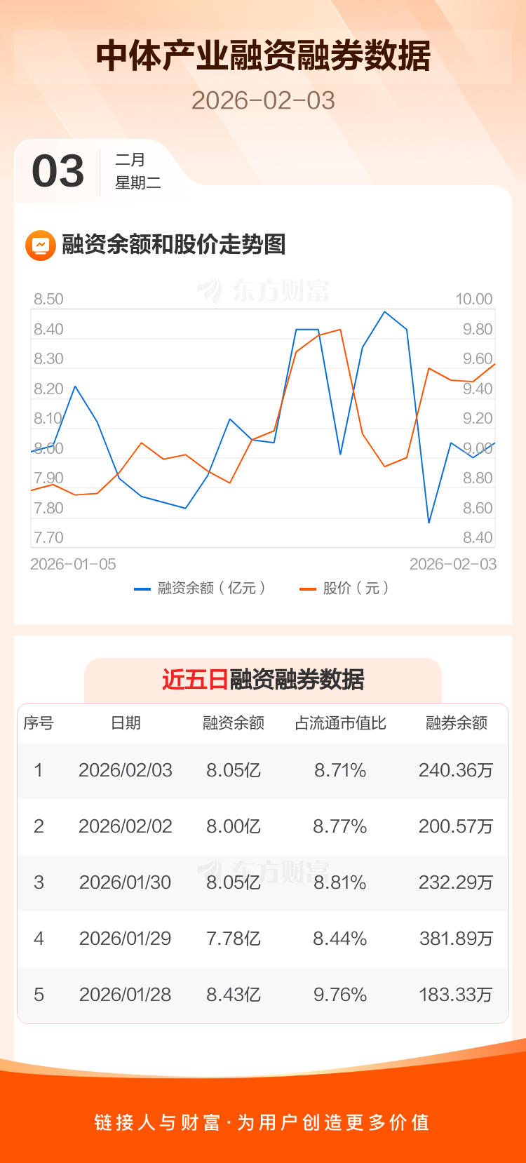 交易所最新数据显示,中体产业于2026年2月3日获融资买入4625.57万元,融资偿还4185.82万元,当日融资净买入439.75万元。目前,该股融资余额8.05亿,占流通市值比例为8.71%。