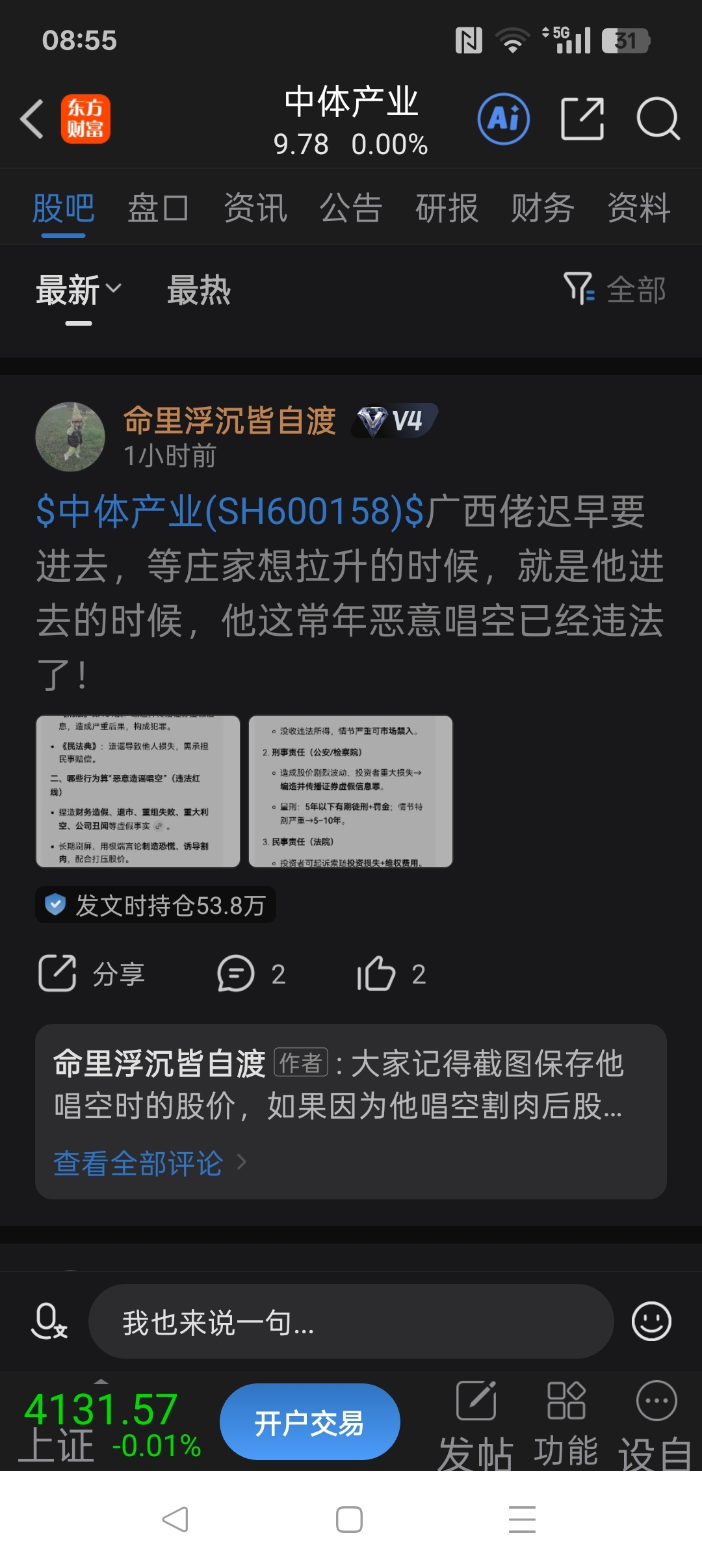 这个人冒充他人已经属于严重违法行为,造谣引导攻击广西IP更是严重违法行为。而且发帖明确提及暗示造谣什么中体产业有专家想拉升这种话术更是明显的违法行为。中体产业长期跑输市场,这是基本事实。