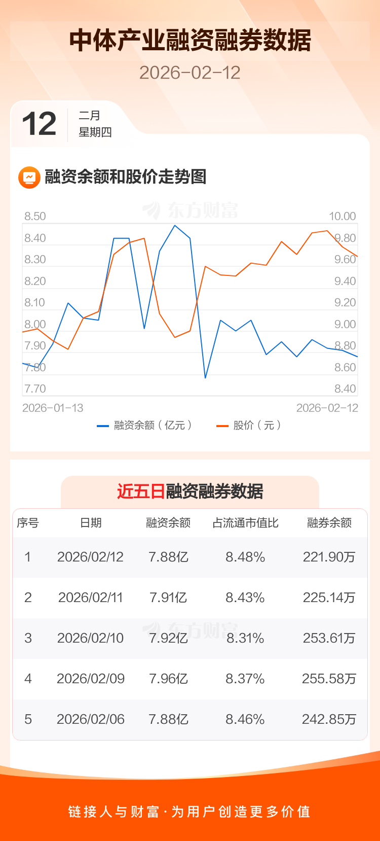 交易所最新数据显示,中体产业于2026年2月12日获融资买入1902.43万元,融资偿还2170.23万元,当日融资净偿还267.79万元。目前,该股融资余额7.88亿,占流通市值比例为8.48%。