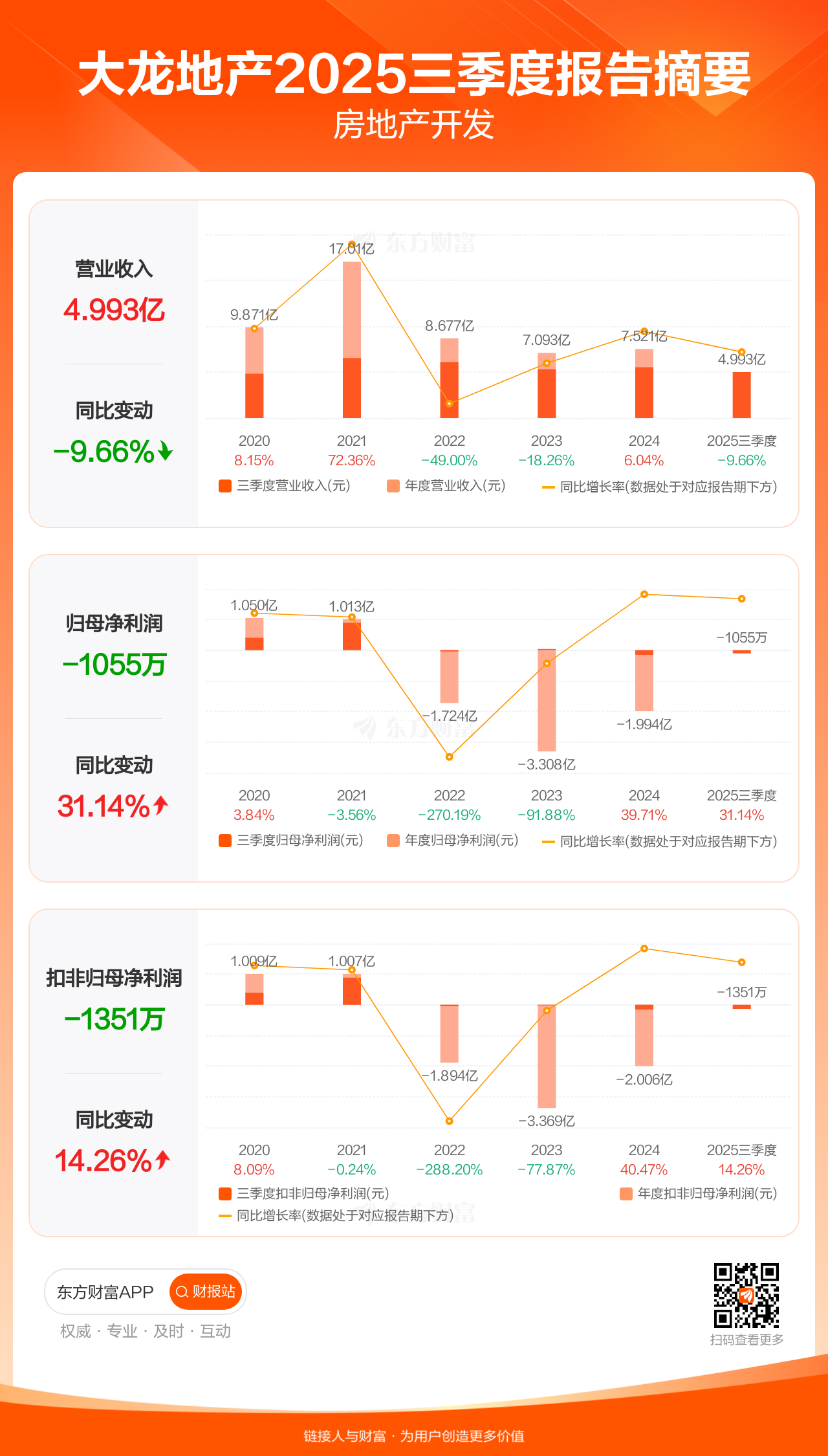 大龙地产10月31日发布2025年三季报显示,公司前三季实现营业收入4.99亿元,同比下滑9.66%;归母净利润-1055.03万元;扣非归母净利润-1351.04万元。