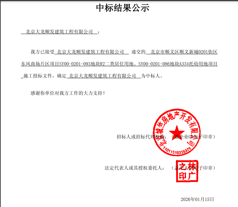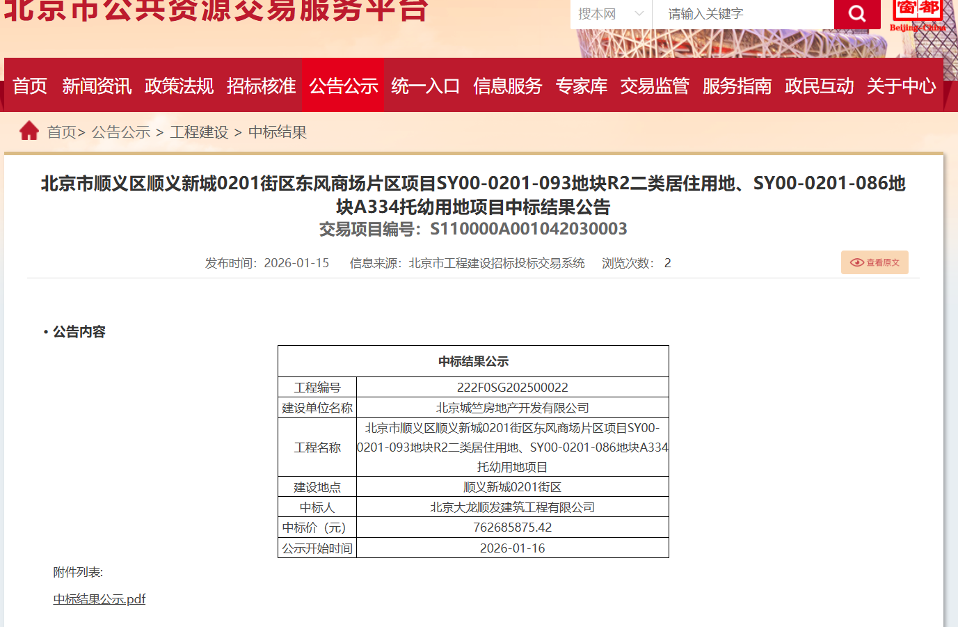 北京市顺义区顺义新城0201街区东风商场片区项目SY00-0201-093地块R2二类居住用地、SY00-0201-086地块A334托幼用地项目中标结果公告