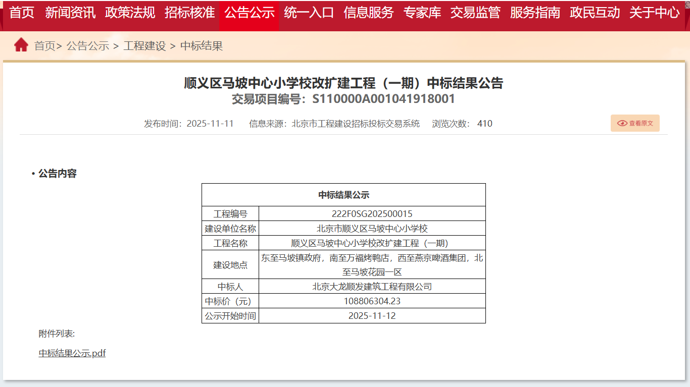 顺义区马坡中心小学校改扩建工程(一期)中标结果公告