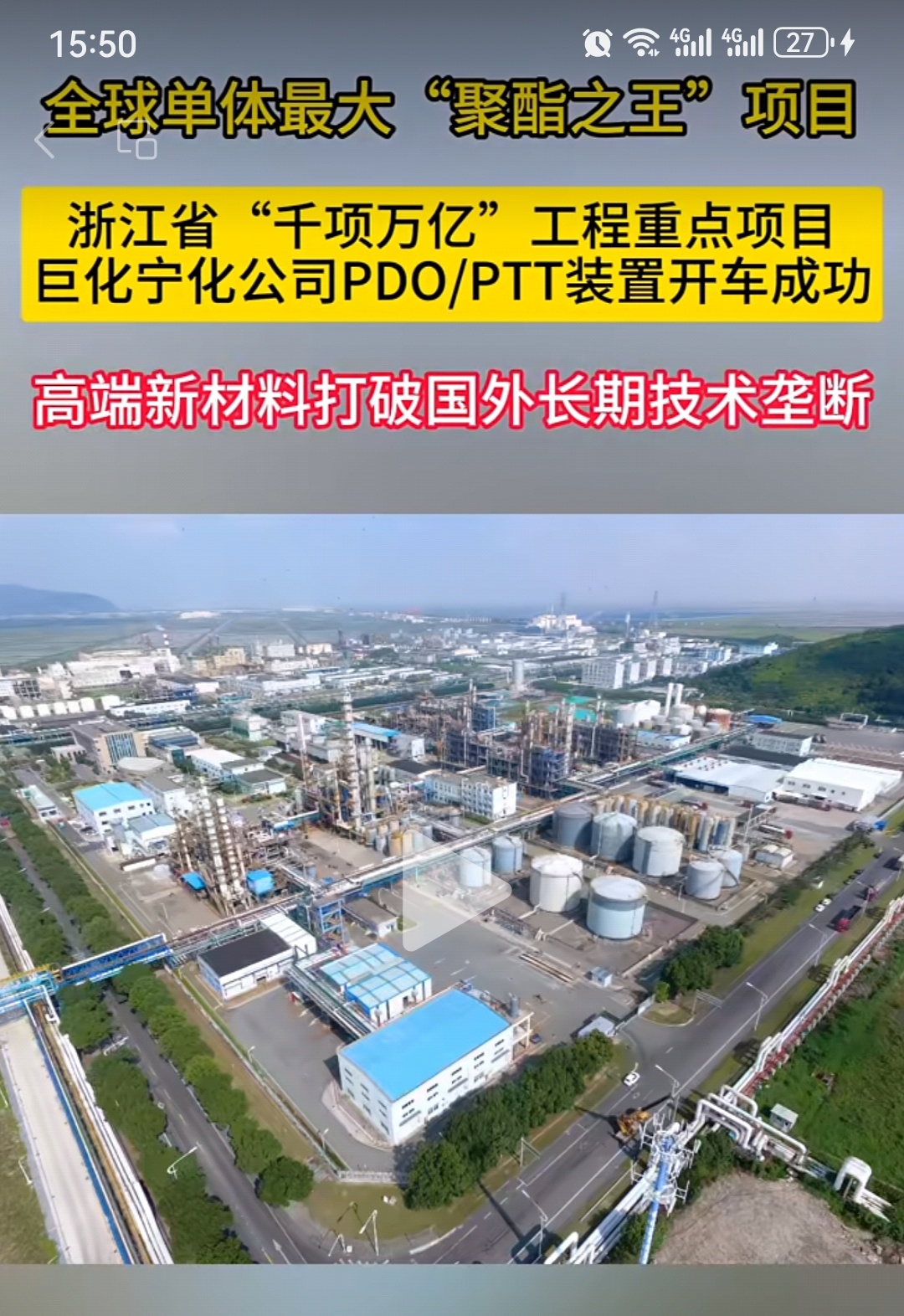 浙江省“千项万亿”工程的重点项目宁化公司PDO/PTT一体化装置成功投产!