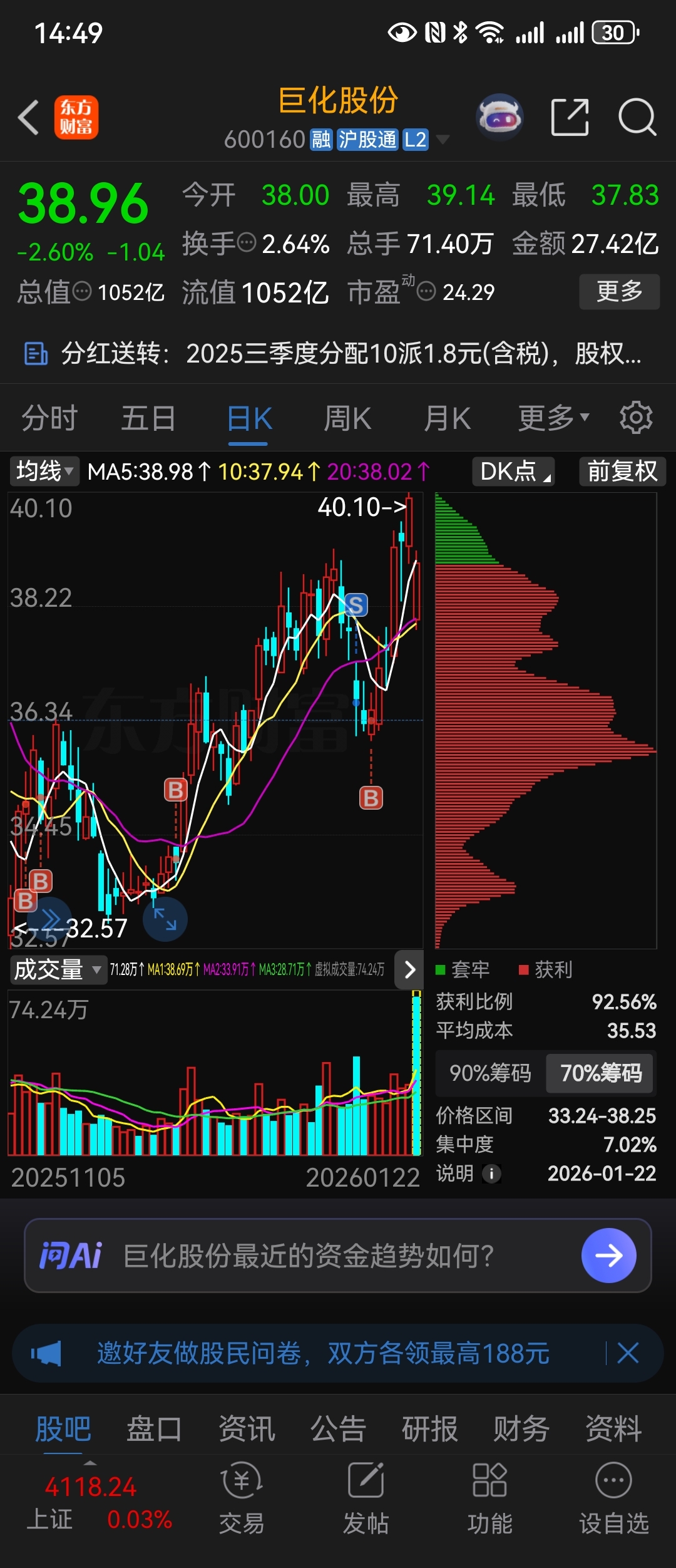 $巨化股份(SH600160)$ 昨天看筹码分布图全是获利盘。短期收益。过高。需震一震。洗出一部分筹码。后续慢慢震荡上行。