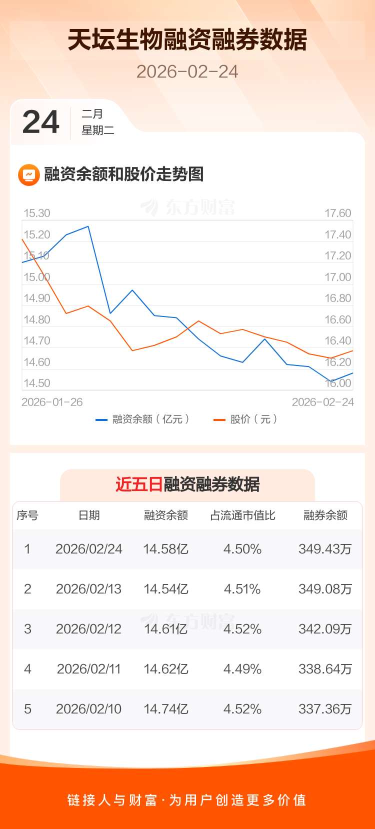 交易所最新数据显示,天坛生物于2026年2月24日获融资买入904.81万元,融资偿还528.40万元,当日融资净买入376.41万元。目前,该股融资余额14.58亿,占流通市值比例为4.50%。