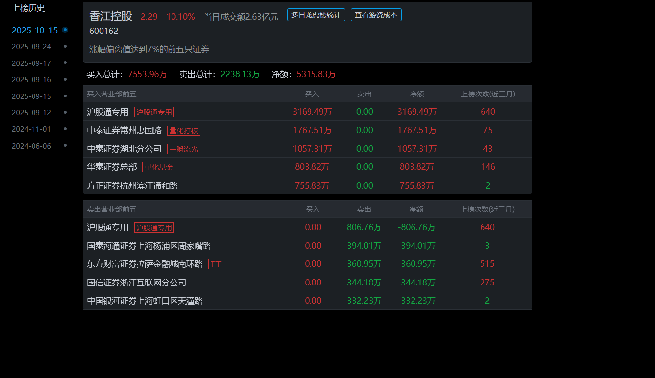 香江控股今日游资龙虎榜席位上榜数据如下!