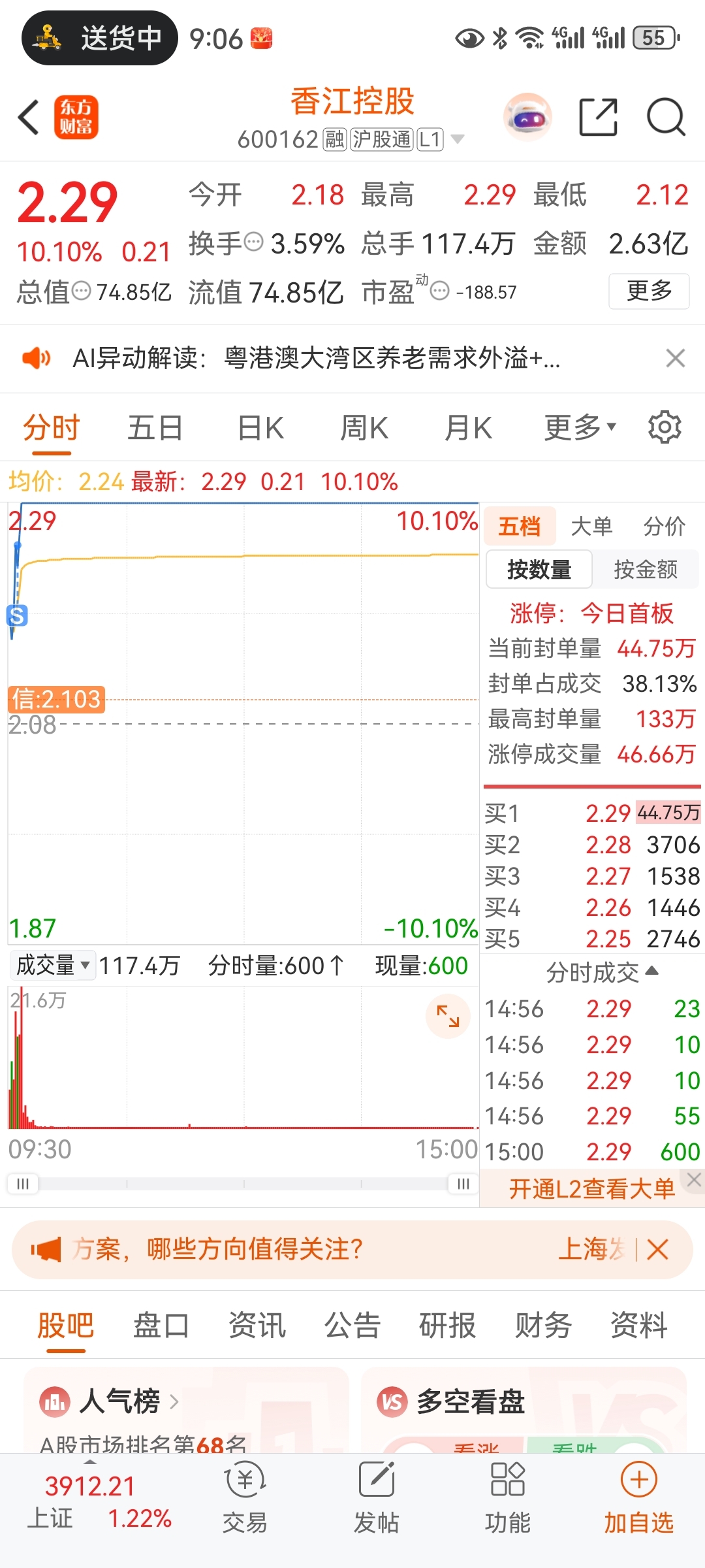 $香江控股(SH600162)$ 卖了,缩量涨停非好事,明天大概率要大跌