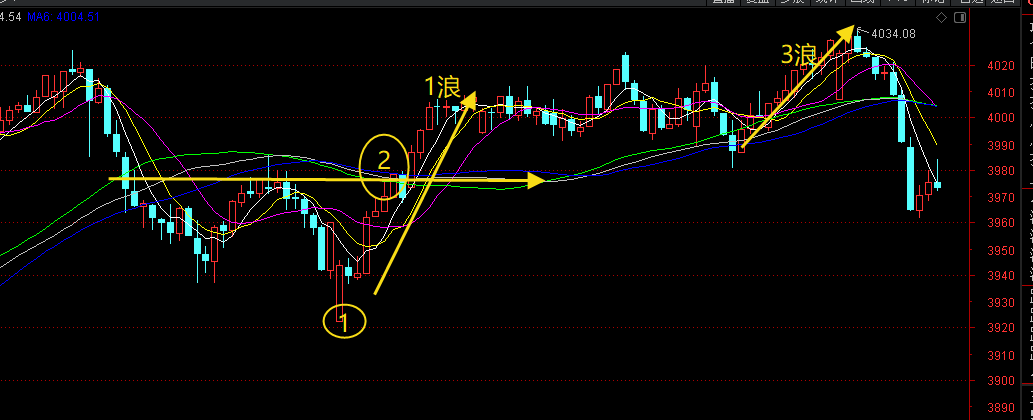 我们通常把3-5天左右的行情视为一个短波段,看30分钟K线即可。而本次30分钟上升浪起始于图中1位置,然后途经了1,3浪拉升,后面是否有5浪,7浪?要走一步看一步,但是一旦跌破颈线2位置,视为本波上升浪就此终结,而这个点位就是3975点。