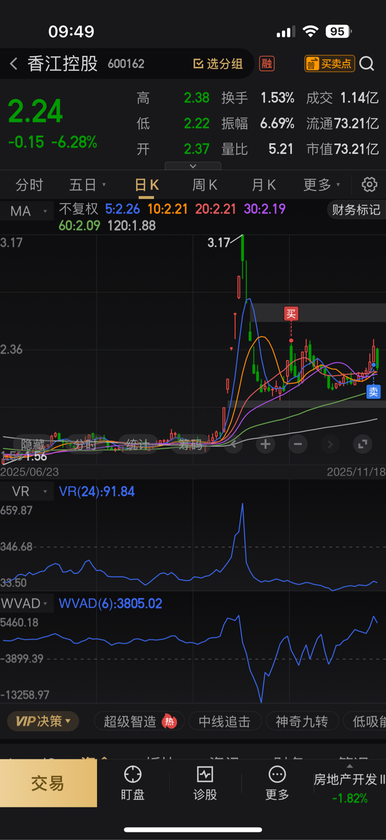$香江控股(SH600162)$ 2.44看来又是顶了。这波又得回到2.1了。上月2.39打板买的买完就跌到2.1。后面涨到2.43没卖。结果又一路跌回2.1。昨天好在2.42卖掉了。赚了几百块,这次估计又得回到2.1了