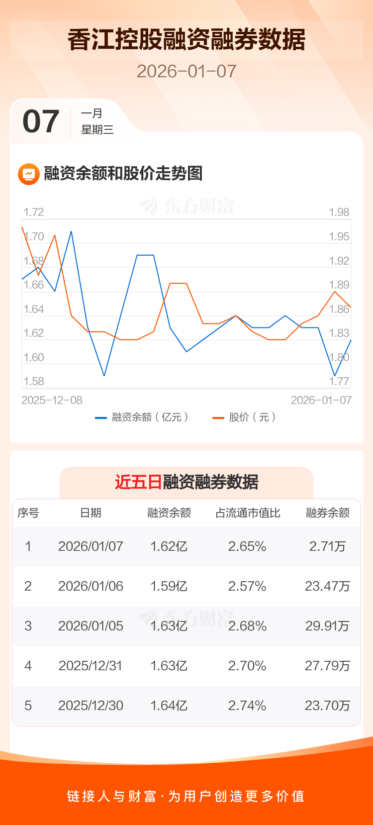 交易所最新数据显示,香江控股于2026年1月7日获融资买入923.09万元,融资偿还588.06万元,当日融资净买入335.03万元。目前,该股融资余额1.62亿,占流通市值比例为2.65%。