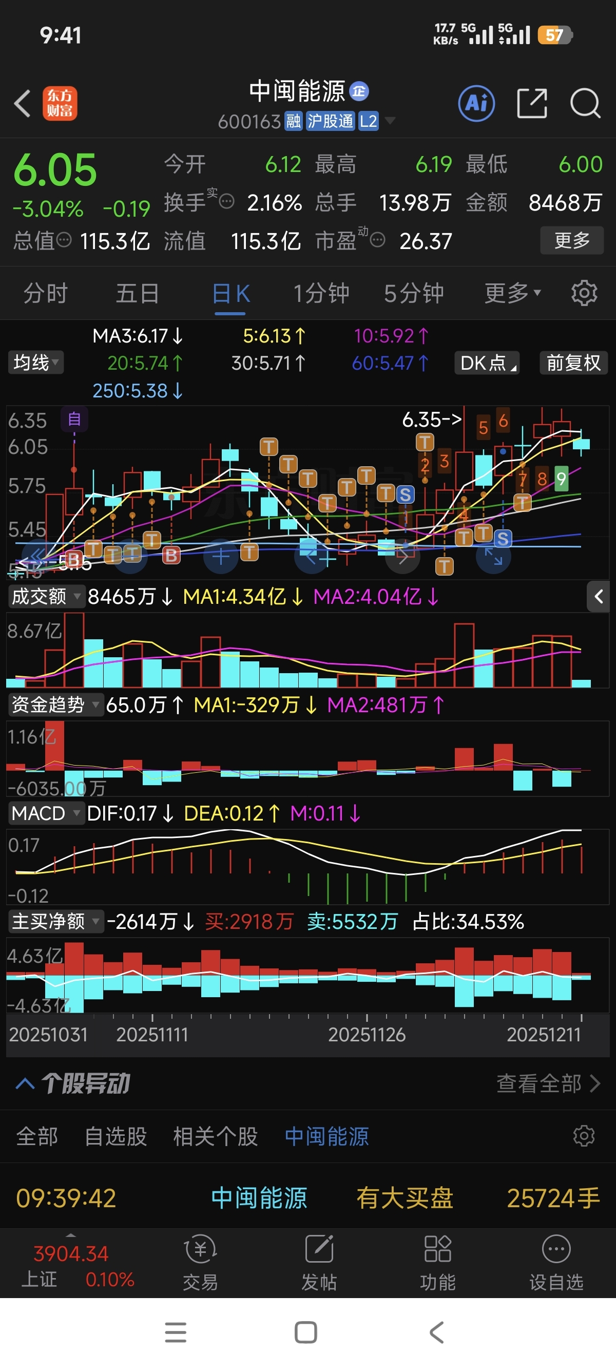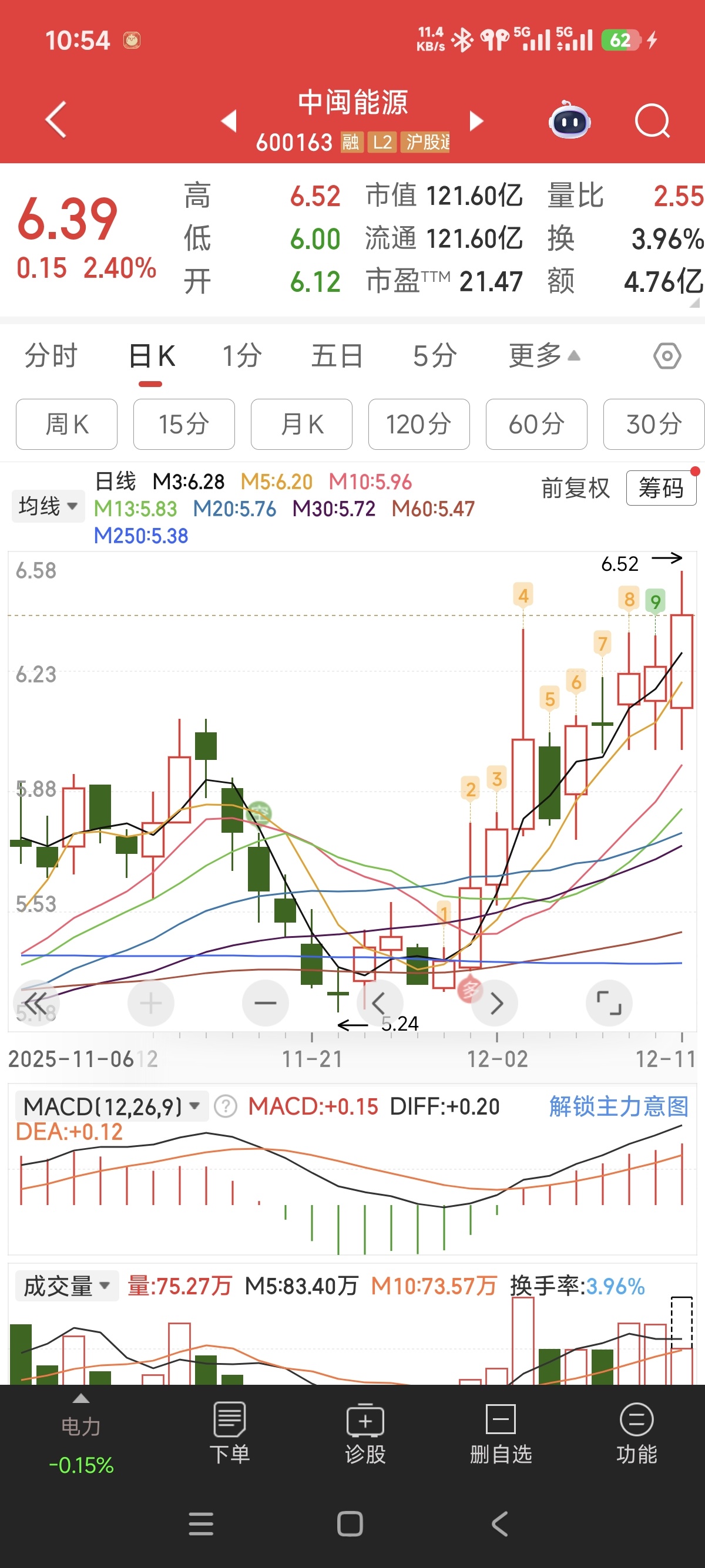 持有中闽能源第36天关键位置我基本持仓等方向再操作的今天第三次回踩6块了事不过3