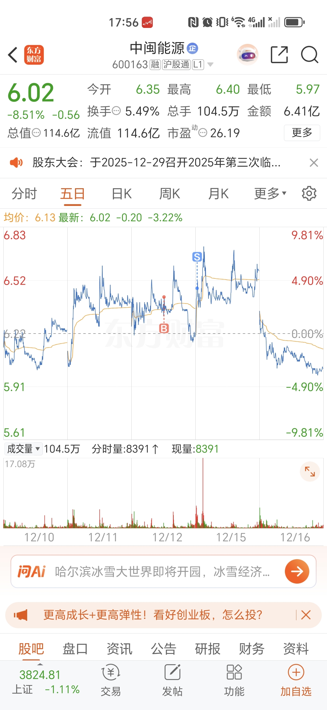 $中闽能源(SH600163)$ 这个票买了就不舒服,昨天跑了