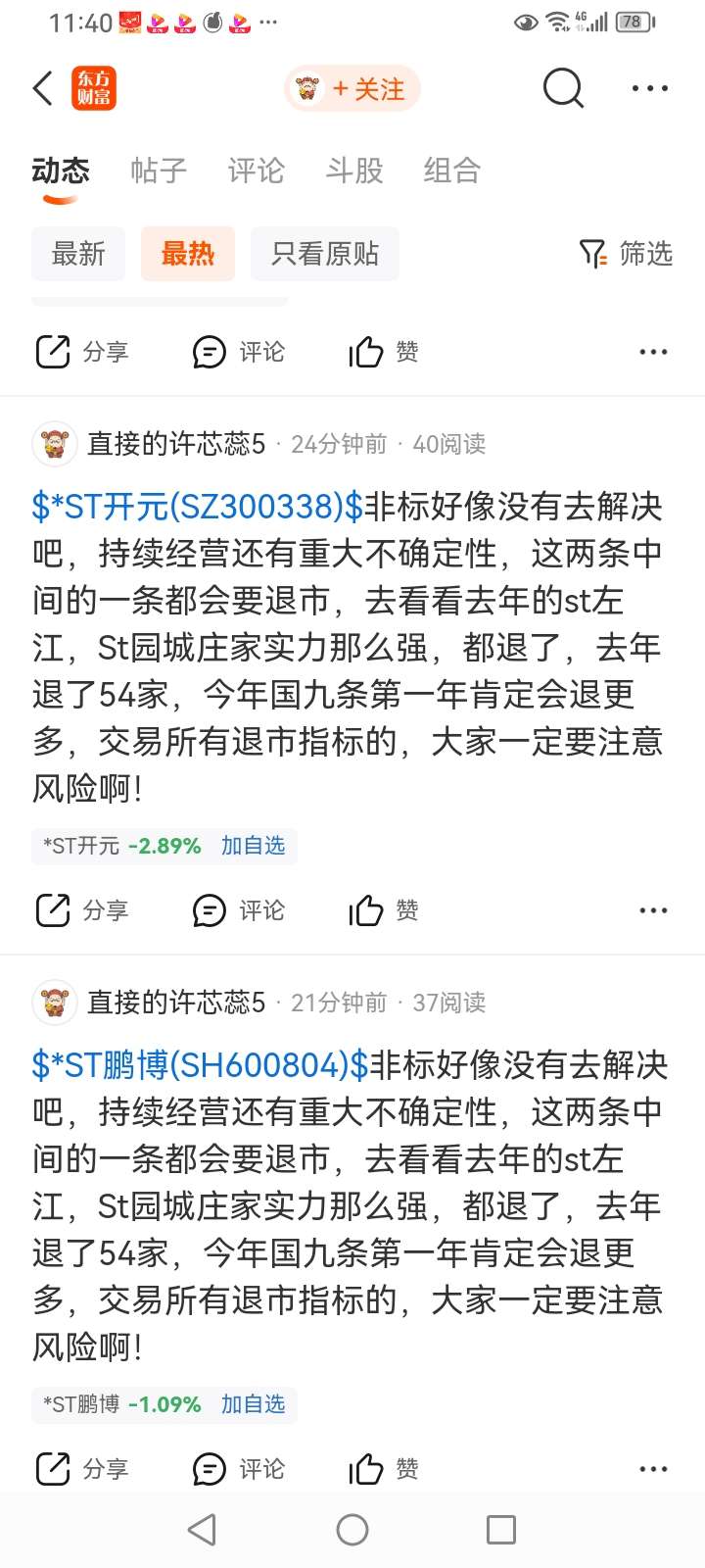 $*ST宁科(SH600165)$ 非标好像没有去解决吧,持续经营还有重大不确定性,这两条中间的一条都会要退市,去看看去年的st左江,St园城庄家实力那么强,都退了,去年退了54家,今年国九条第一年肯定会退更多,交易所有退市指标的,大家一定要注意风险啊!