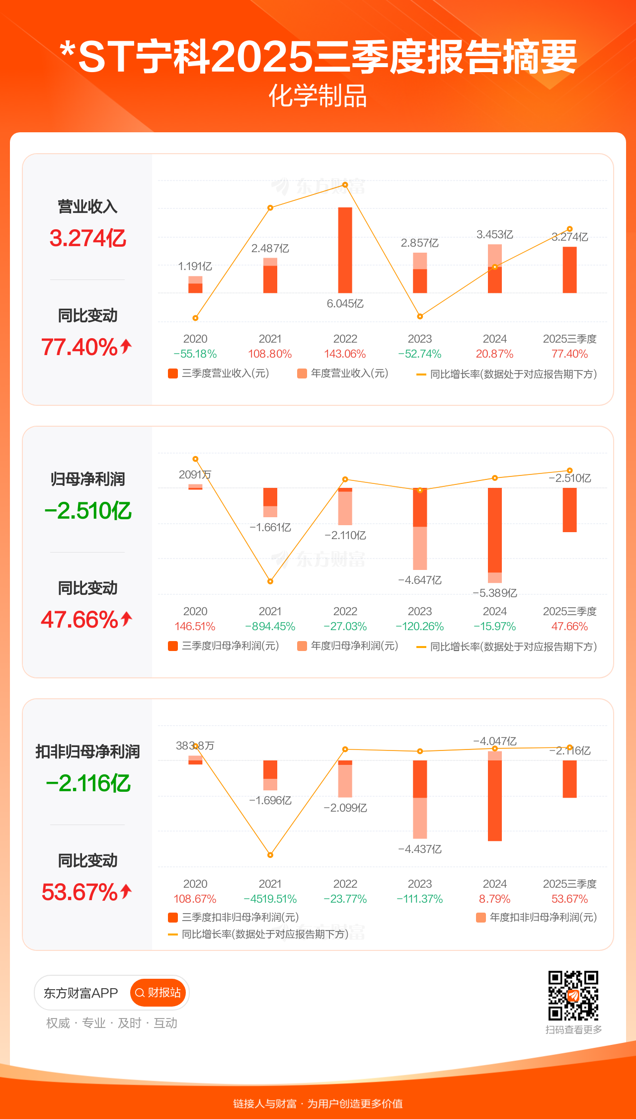 *ST宁科10月31日发布2025年三季报显示,公司前三季实现营业收入3.27亿元,同比增长77.40%;归母净利润-2.51亿元;扣非归母净利润-2.12亿元。