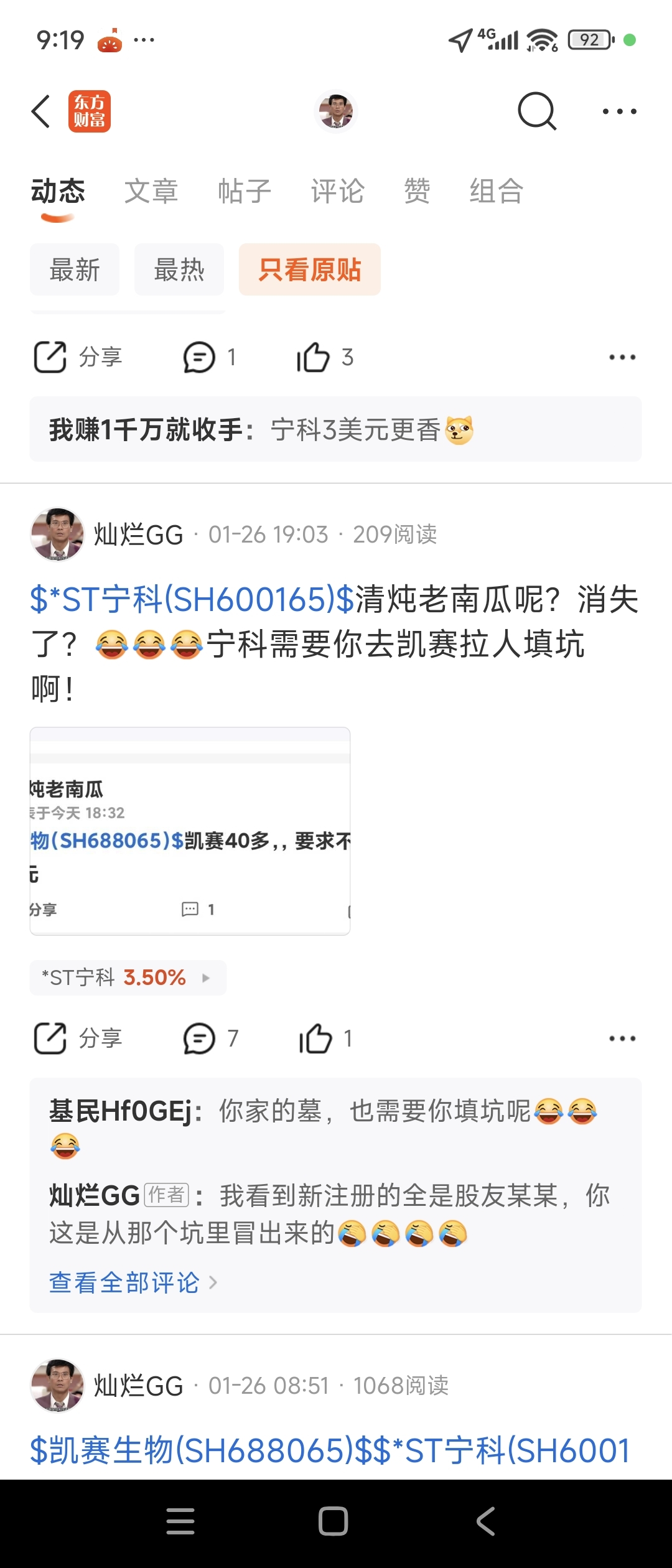 $*ST宁科(SH600165)$ 有人说你天天唱空宁科不累吗?不累!因为己经成为习惯了,缘起去年我买了凯赛,老南瓜几个人来凯赛吧拉人,从此杠上了,以前唱空只是抬杠,如今老南瓜那几个人消失了,现在唱只是想验证自己的眼光!别多想了!没人会给一个马上V6的人发贴开得起工资!