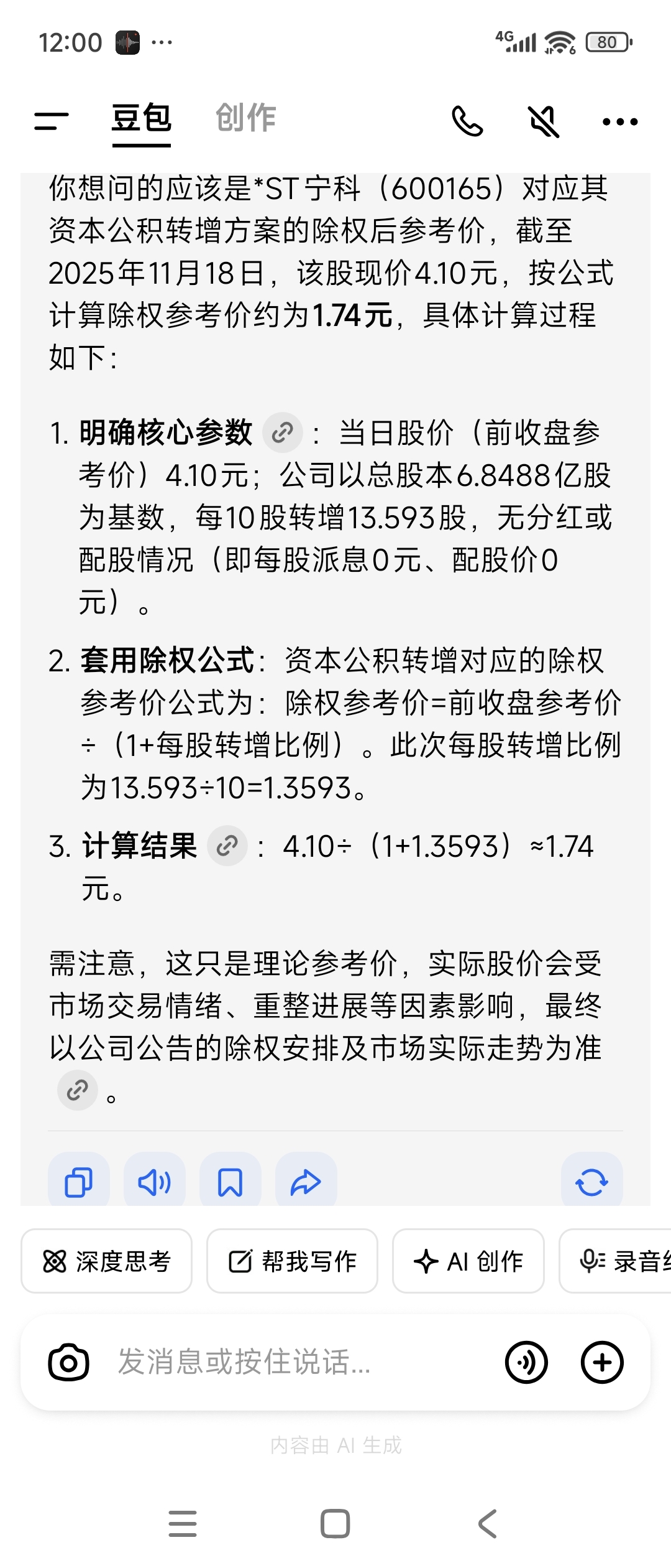 $*ST宁科(SH600165)$ 问了一下豆包除权后大概是什么价,回答如下