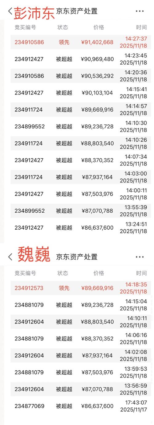 细看竞价明细,这俩牛散都是潜伏到延时阶段才跳出来绝杀,彭被超越一次,等了4分钟后再次出价拿下。魏更牛逼,直接一招秒杀!