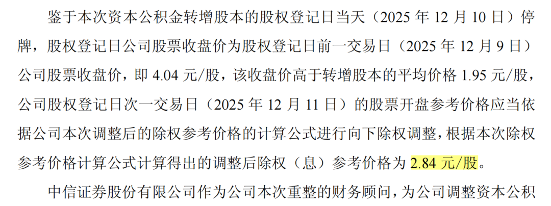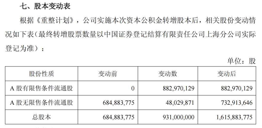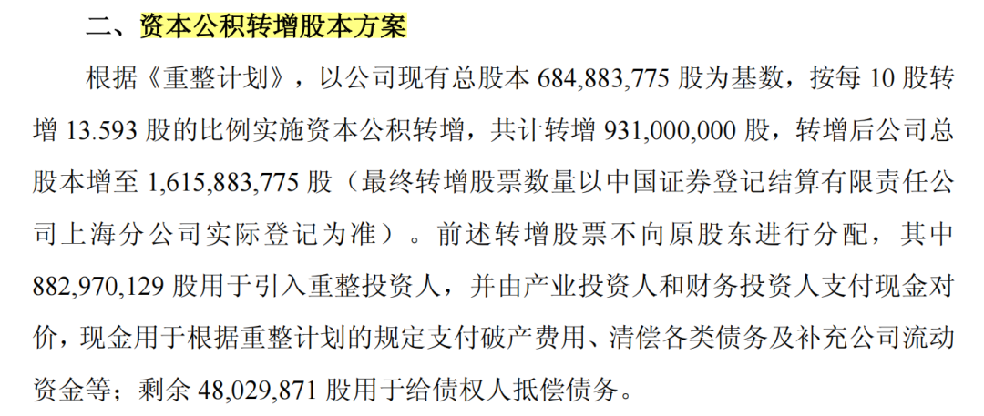 此前,公司发布《重整计划》显示,以公司现有总股本6.85亿股为基数,按每10股转增13.59股的比例实施资本公积转增,共计转增9.31亿股,转增后公司总股本增至16.16亿股。