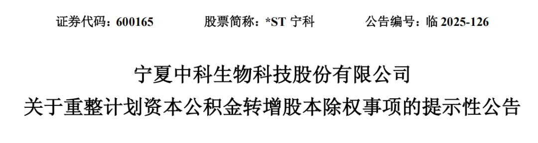 12月9日晚间,*ST宁科(600165)公告称,公司重整计划资本公积金转增股本方案的具体实施细节已确定,股权登记日为12月10日,除权除息日及转增股份上市日为12月11日,除权参考价为2.84元/股。12月9日,*ST宁科收报4.04元/股,涨2.28%。