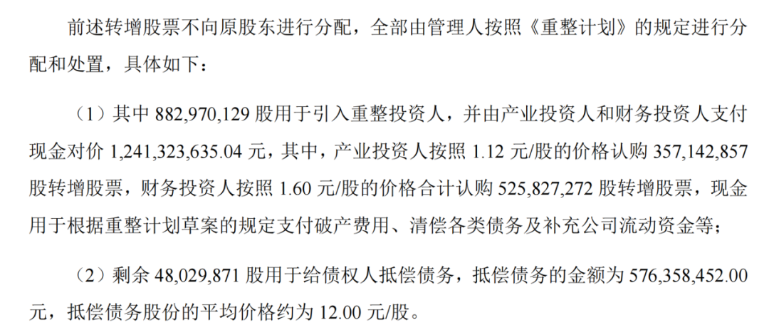 公司强调,前述转增股票不向原股东进行分配,其中8.83亿股用于引入重整投资人,并由产业投资人和财务投资人支付现金对价,现金用于根据重整计划的规定支付破产费用、清偿各类债务及补充公司流动资金等;剩余0.48亿股用于给债权人抵偿债务。