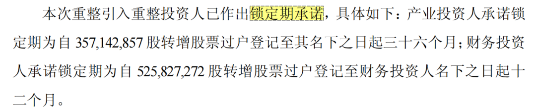 此外,本次重整引入重整投资人已作出锁定期承诺,具体如下:产业投资人承诺锁定期为自3.57亿股转增股票过户登记至其名下之日起三十六个月;财务投资人承诺锁定期为自5.26亿股转增股票过户登记至财务投资人名下之日起十二个月。