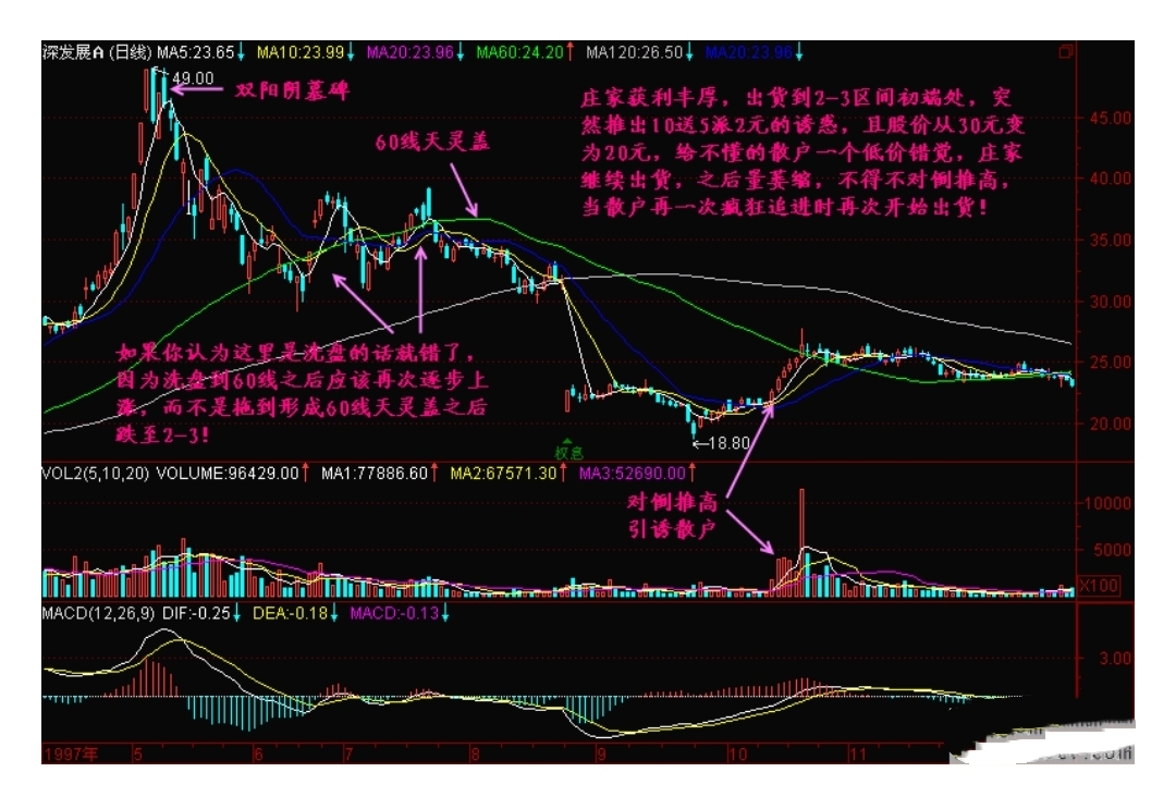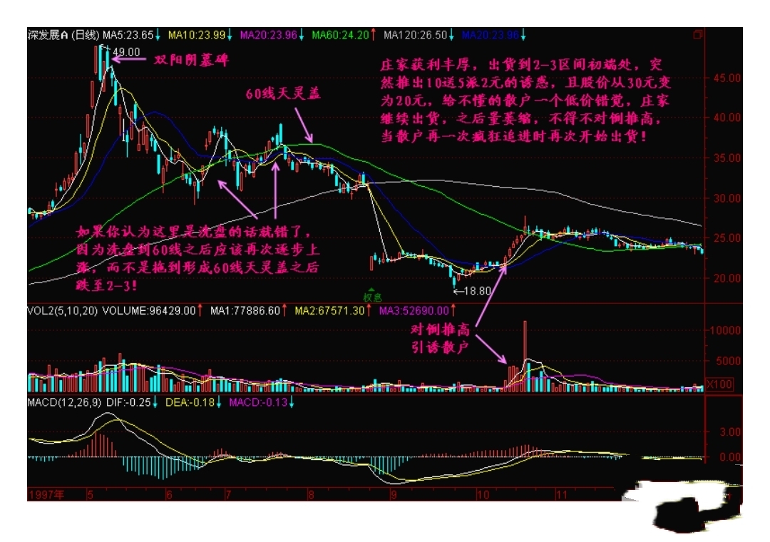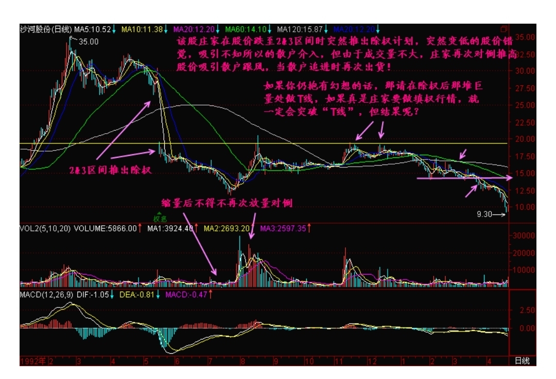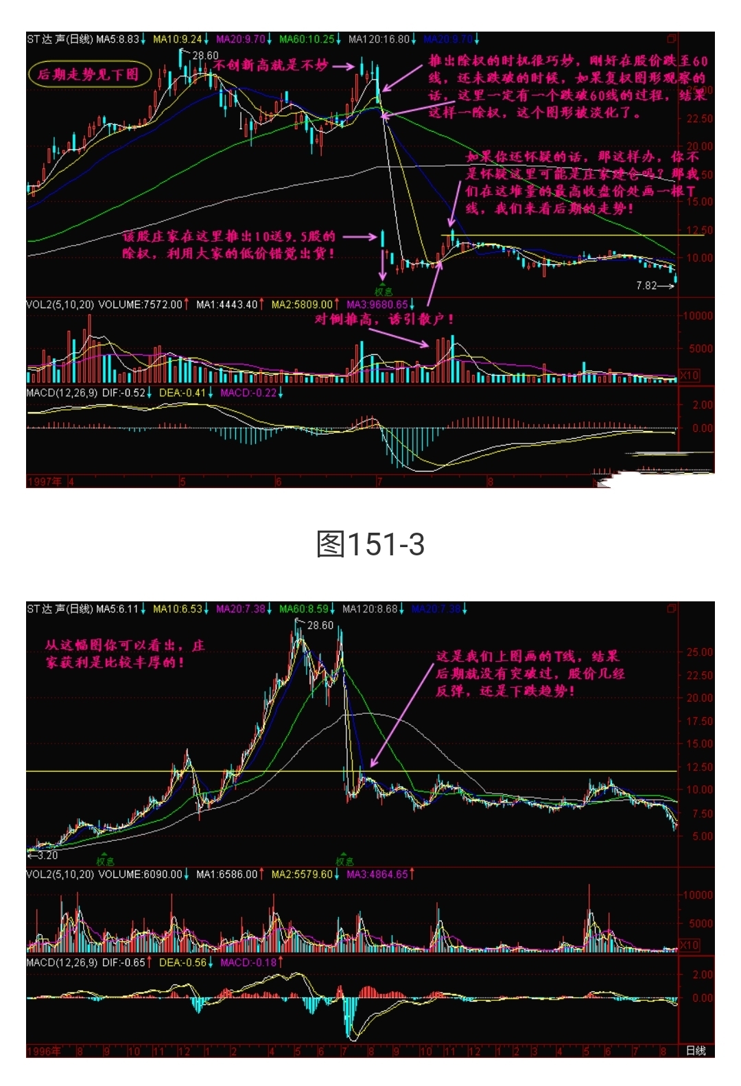 我们把今天这节课叫做【利用除权出货】,或者叫【利用除权低价错觉出货】。这个时候出货,会有一些人来接盘,出货的日子会好过一点,成交量也能放出来。前面放不出量来,现在能放出量来,然后再跌下来以后,量又放不出来了。这样,庄家就会来一个放量对倒往上冲,冲上去有了跟风盘以后,再反手做空,这样一根阳线和一根阴线就形成了【一拉一出货】的效果。