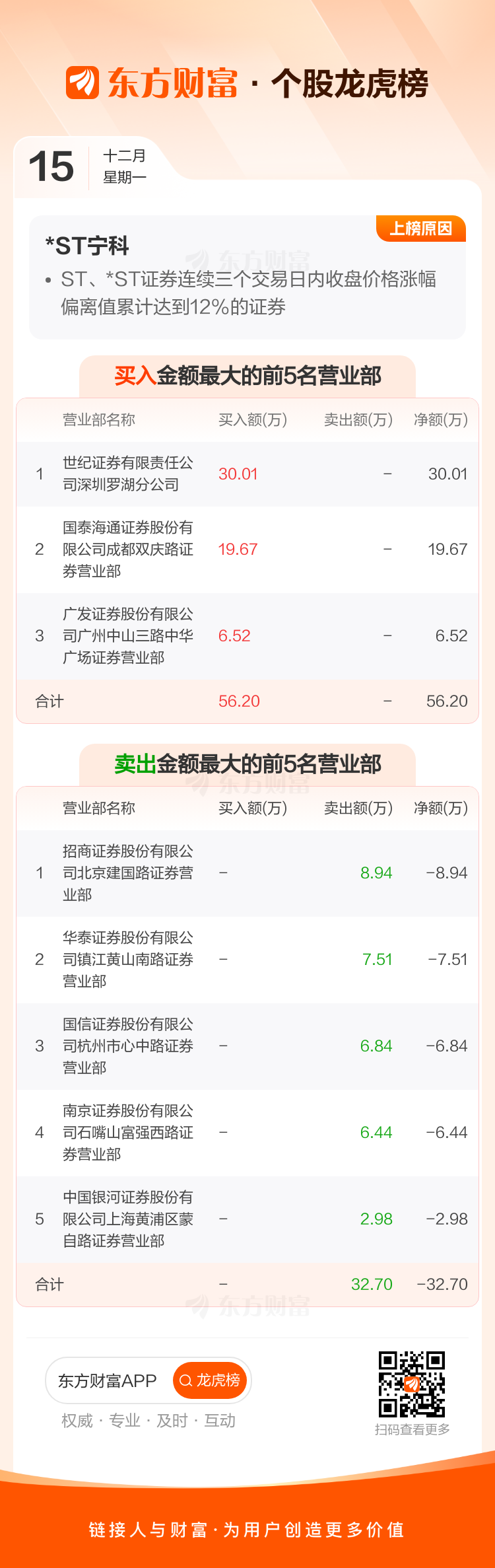 交易所2025年12月15日公布的交易公开信息显示,*ST宁科因成为ST、*ST证券连续三个交易日内收盘价格涨幅偏离值累计达到12%的证券上榜。*ST宁科当日收报3.29元,涨跌幅5.11%,换手率0.00%,成交额6.52万。异常期间12月11日至12月15日,期间涨幅15.85%,累计偏离值16.68%,区间成交额56.20万。
