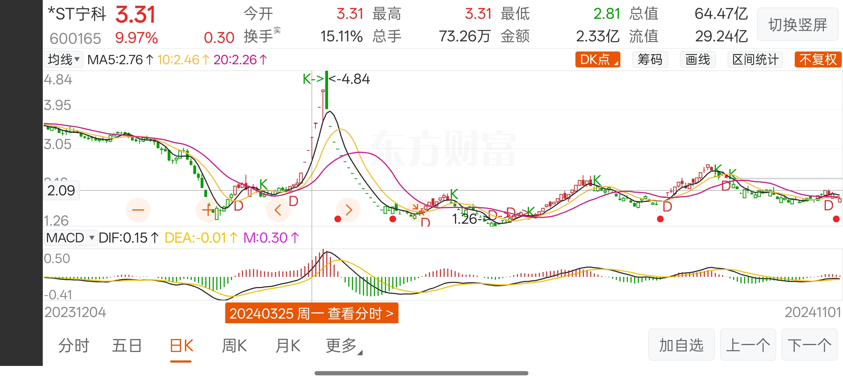 $*ST正平(SH603843)$ 其实真有点模仿宁科了。只是因为停牌25天+5cm小短腿,导致本来有潜力有人气上12.88,结果就上到了8.66(≈3.31的宁科)就截止了!所以我后续也是让st正平参照st宁科了,既然4.47相当于1.64。2.67倍的话,那宁科后面5.4元过,这么来看正平也能st时上14.42!
