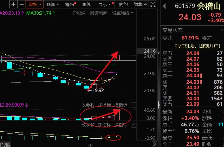 3、$会稽山(SH601579)$  :非白酒+白酒概念+共同富裕示范区+沪股通+融资融券,全国运营历史最悠久的黄酒企业之一,位居黄酒行业前三位,黄酒的生产、销售和研发,K线持续上行,量能持续放量上涨,MACD出现金叉,这些都是启动上涨的标志。