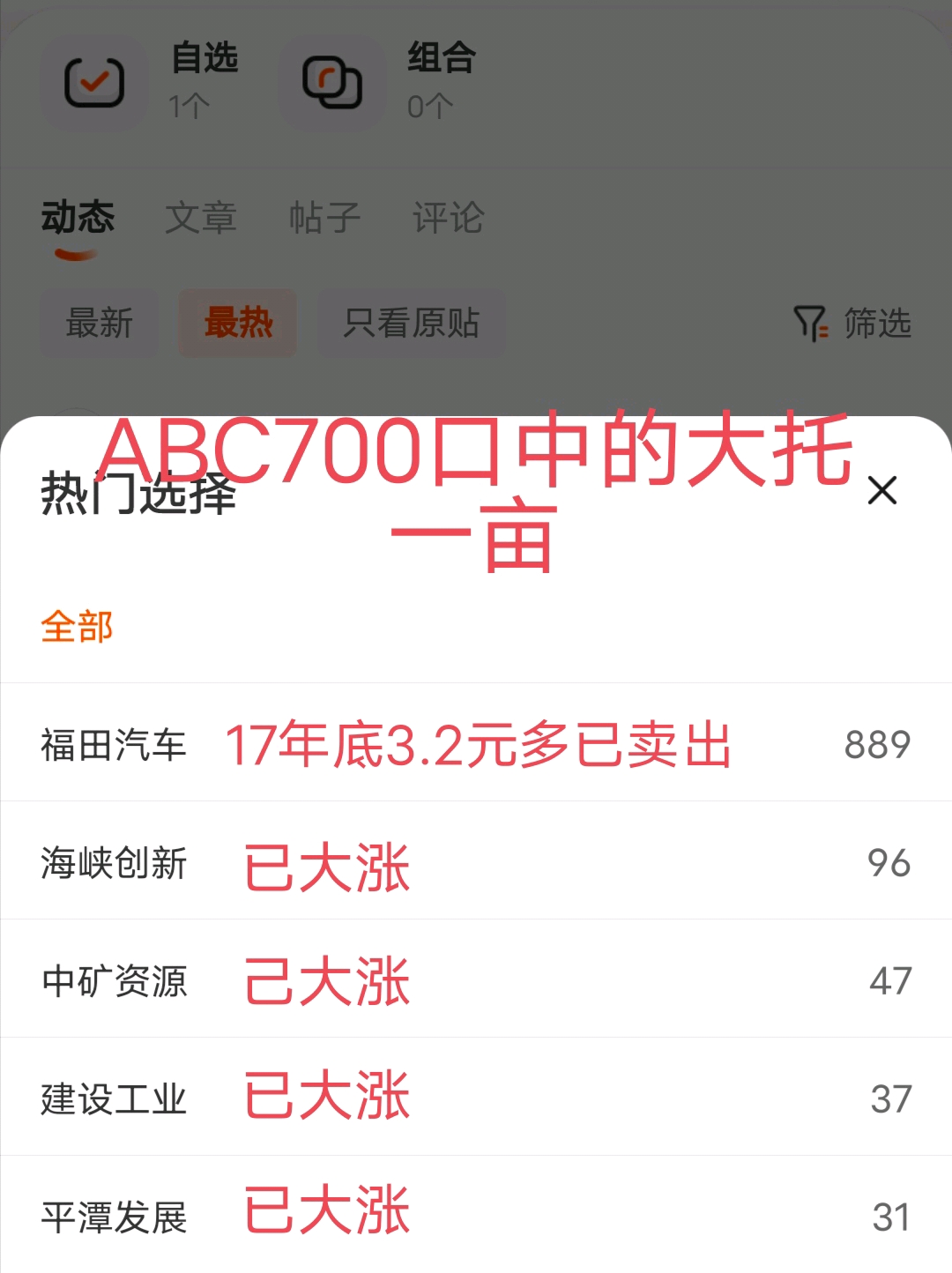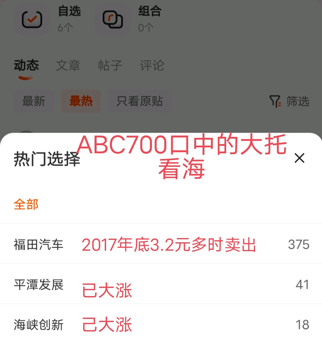 ABC700早先持续怒喷看海与一亩是此吧最大的庄托代表人物之一。今天看了下他一亩、看海的股,当年(2017年)3.20多元卖出非常正确,其他股纷纷大涨!ABC700,红楼是庄托吗?看海一亩是庄托吗?凤凰财经杂志是庄托吗?股友老尚是庄托吗?这些年你喷周过多少股友你还记得清吗?