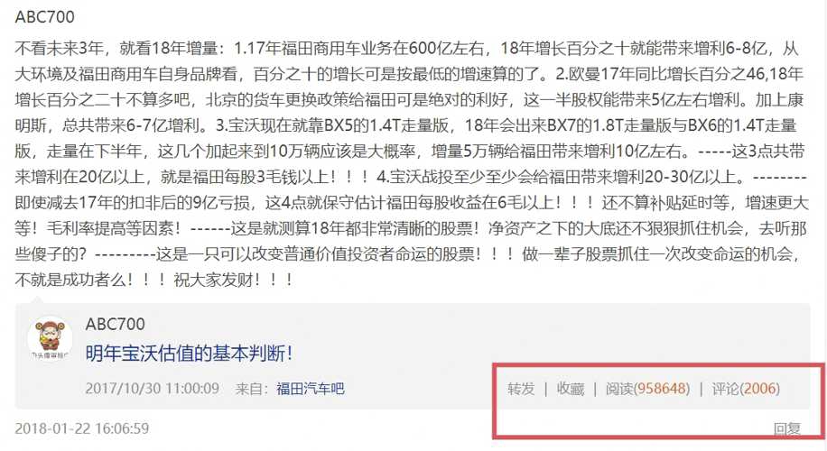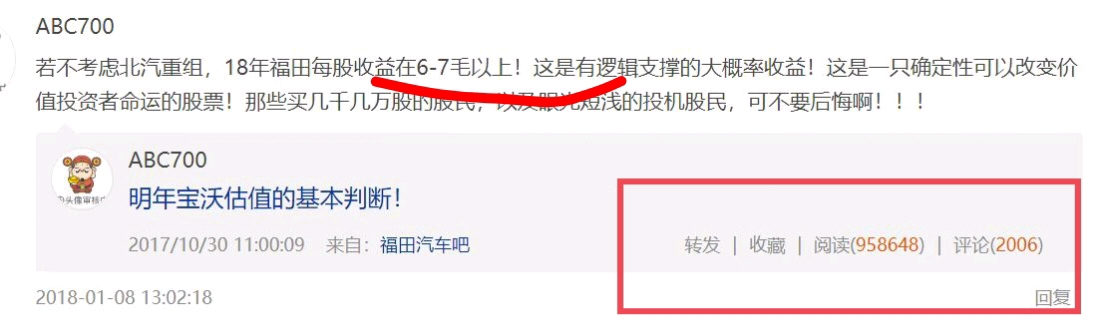 ABC700一则《宝沃估值帖》点击量达到惊人的90多万次!狂吹股价却从3元多一路跌至1.49元!大量股友多次提及此帖提及此狂吹史!删了有何用?你应该对自已狂吹误导他人及喷周他人的行为反思,而不是删了去狡辩,变本加厉的甚至去祖周股友家人,能掩盖得了吗?