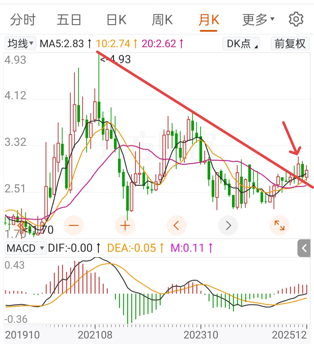 4.93元以来的下降趋势已经突破回踩完成,下降趋势已经改变,开始走上涨趋势!