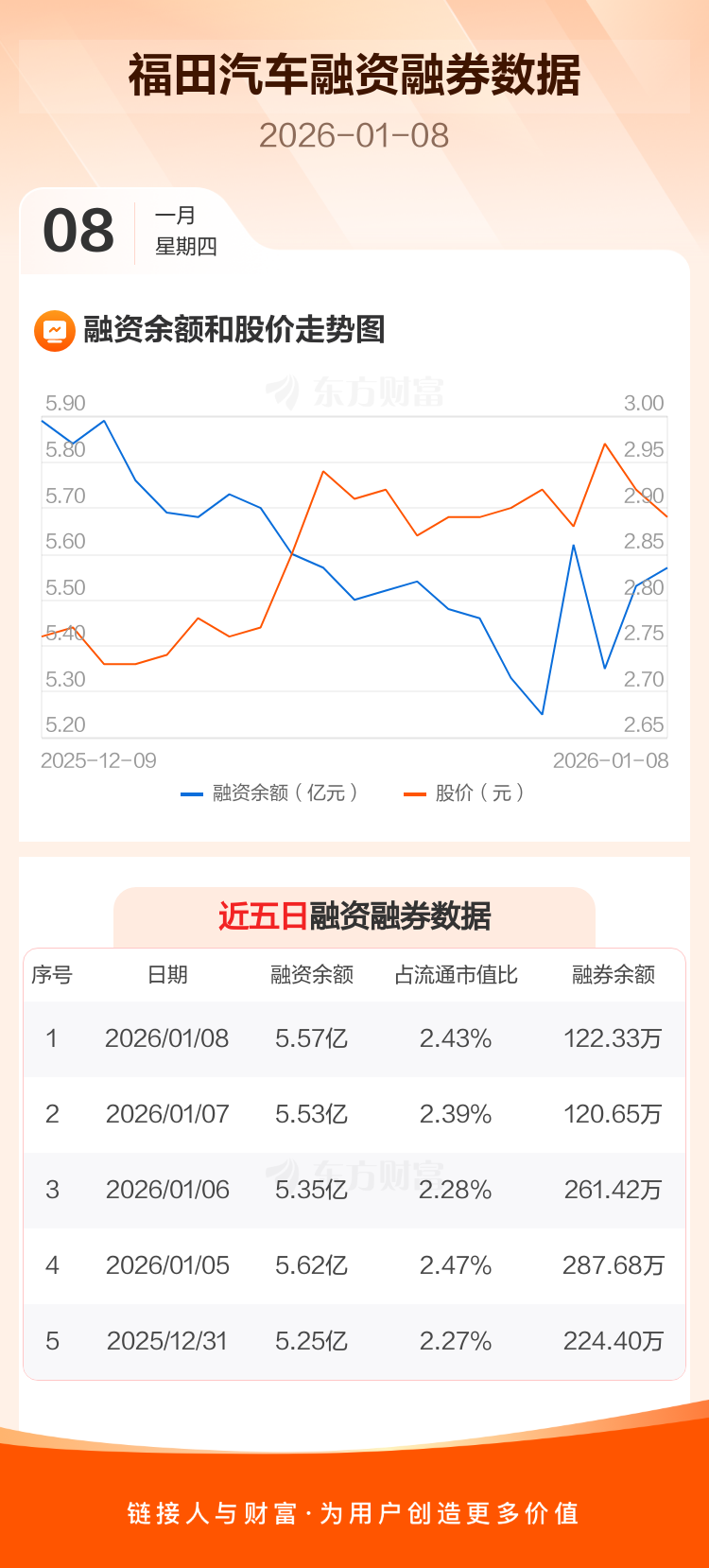 交易所最新数据显示,福田汽车于2026年1月8日获融资买入4030.35万元,融资偿还3597.86万元,当日融资净买入432.48万元。目前,该股融资余额5.57亿,占流通市值比例为2.43%。