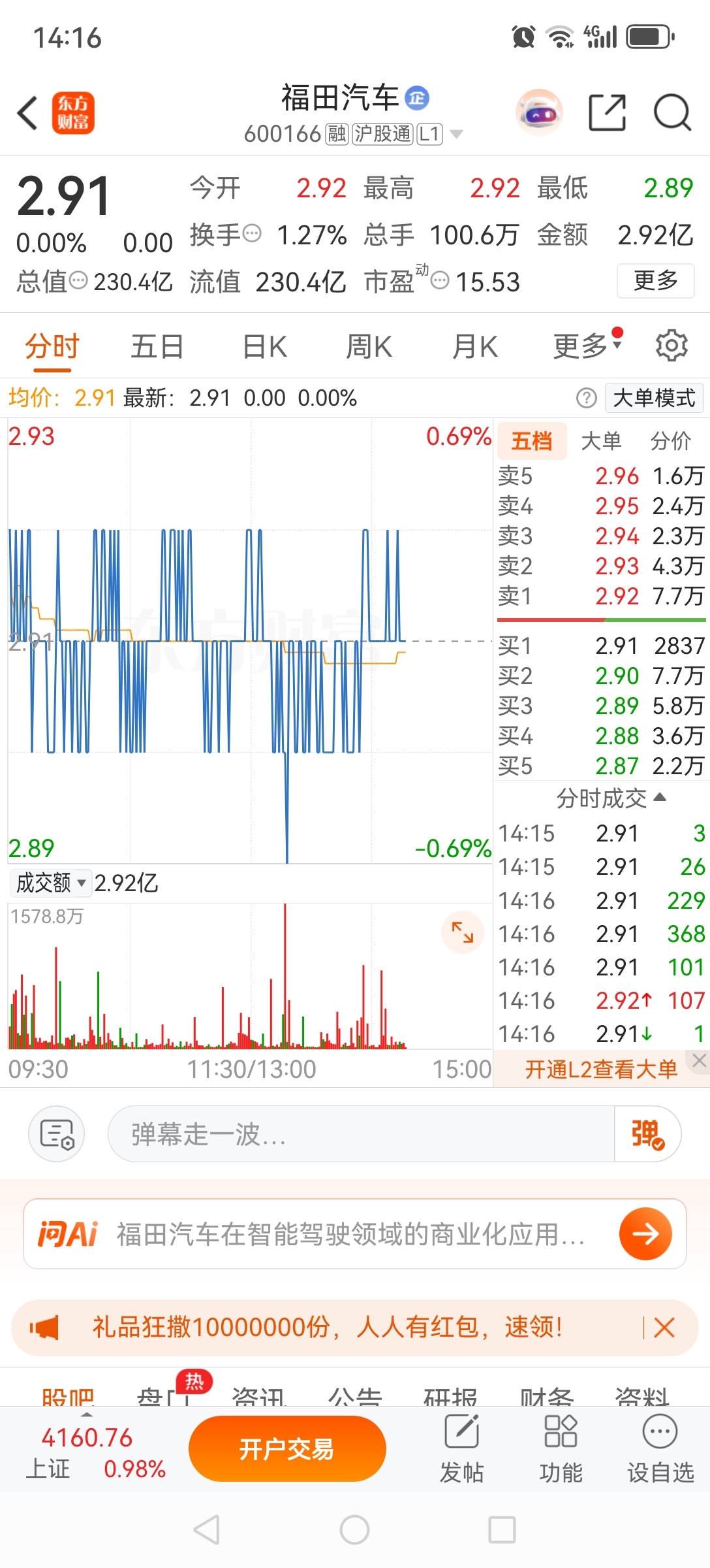 $福田汽车(SH600166)$ 上下各7.7万多手买卖单!