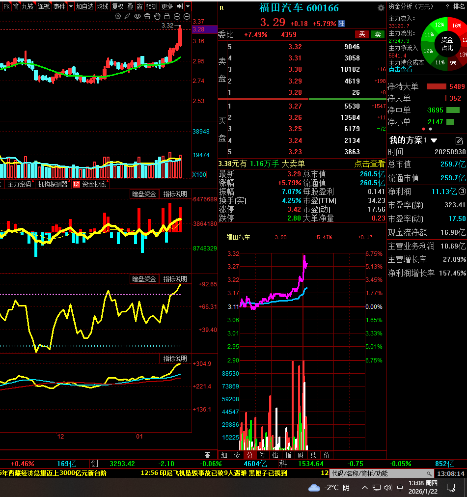 0122星期四 福田汽车 主力动向