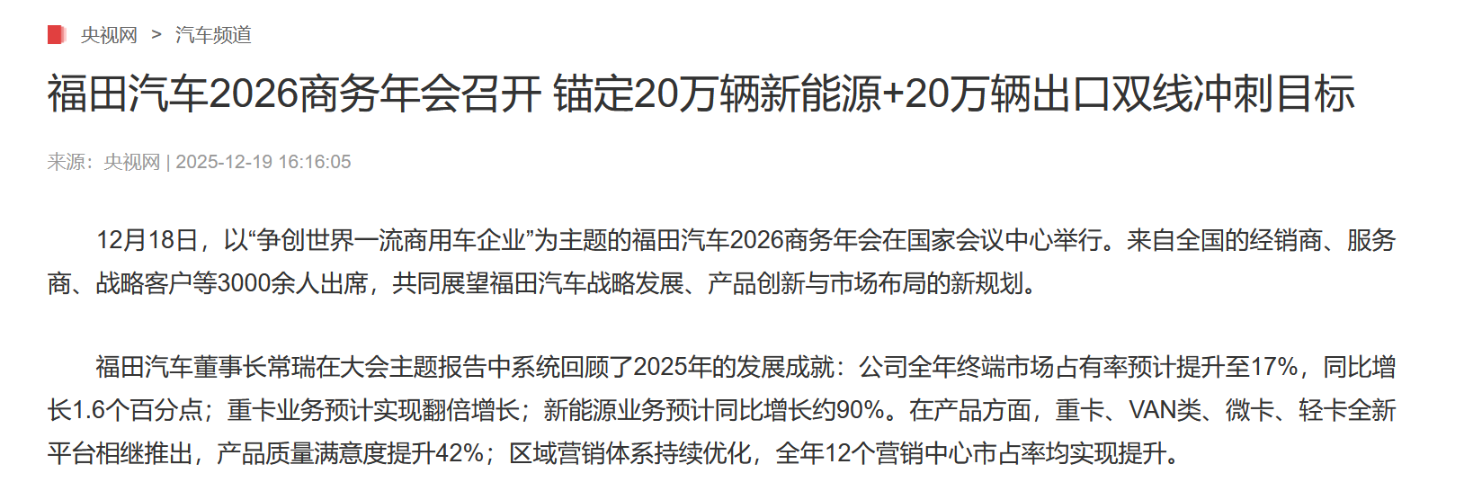 然后我又看到一个新闻来自央视网福田汽车2026商务年会召开锚定20万辆新能源+2