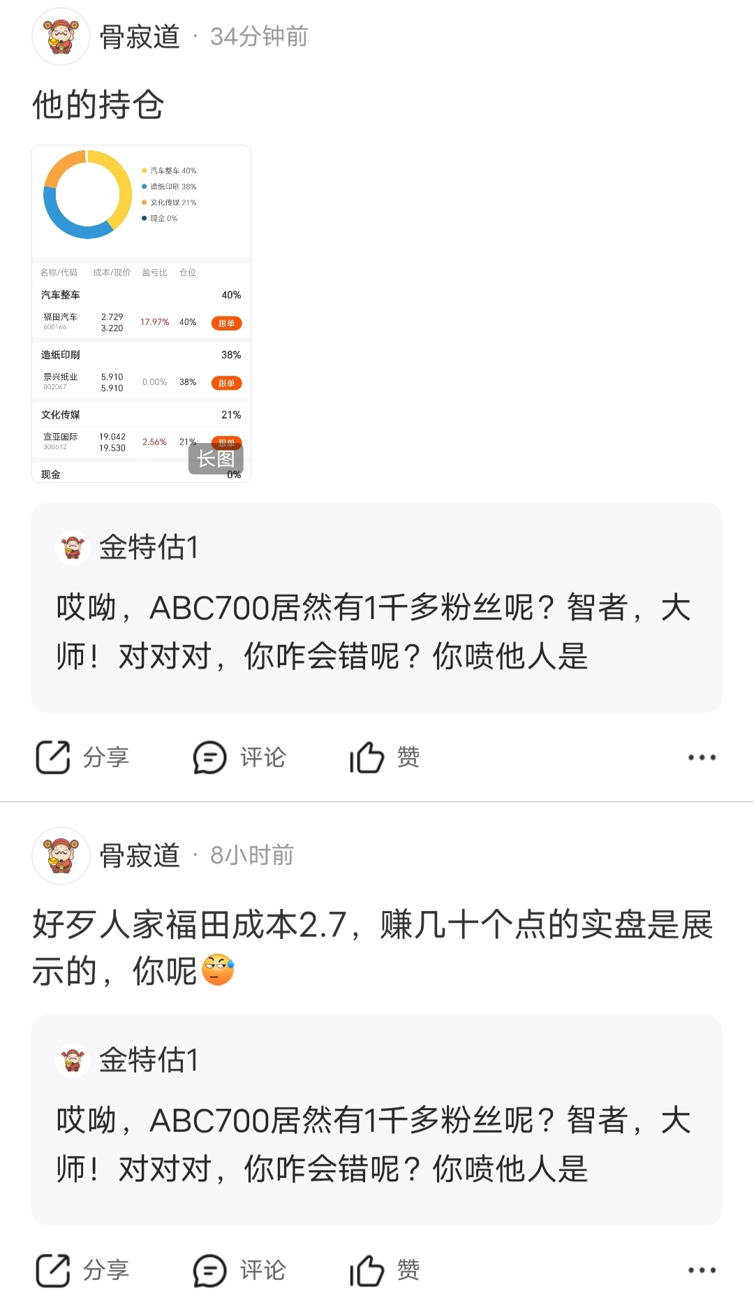 有股友晒出ABC700的持仓,他如此卖力鼓吹持仓占比才40%?这让他的那些信徒咋