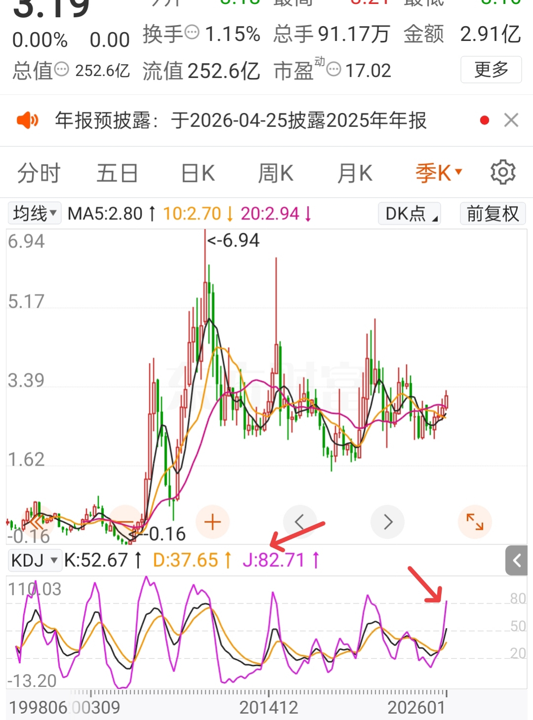 每次季线级别kdj的J值达到80以上都是进入强势上涨阶段!这次是历史第7次,前6次都是大涨!