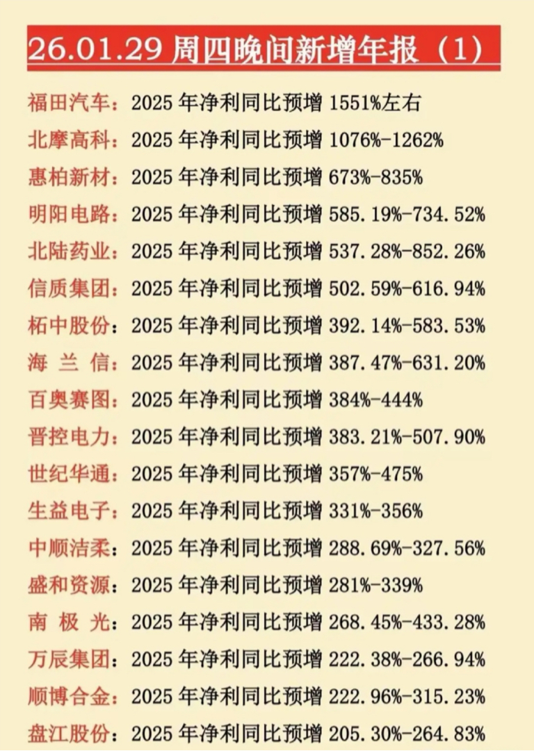 1. $福田汽车(SH600166)$ :2025年净利润预增1551%左右,作为商用车龙头,受益于行业周期复苏与订单回升,叠加成本优化,业绩爆发式增长。