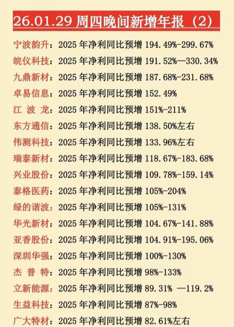本次披露的年报预增标的覆盖多行业,高增凸显周期复苏与业务突破,反映A股多板块盈利改善趋势。后续需关注业绩兑现能力与持续性,高增标的或成市场关注焦点。
