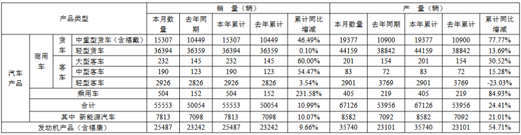 福田汽车1月产销量均同比增长