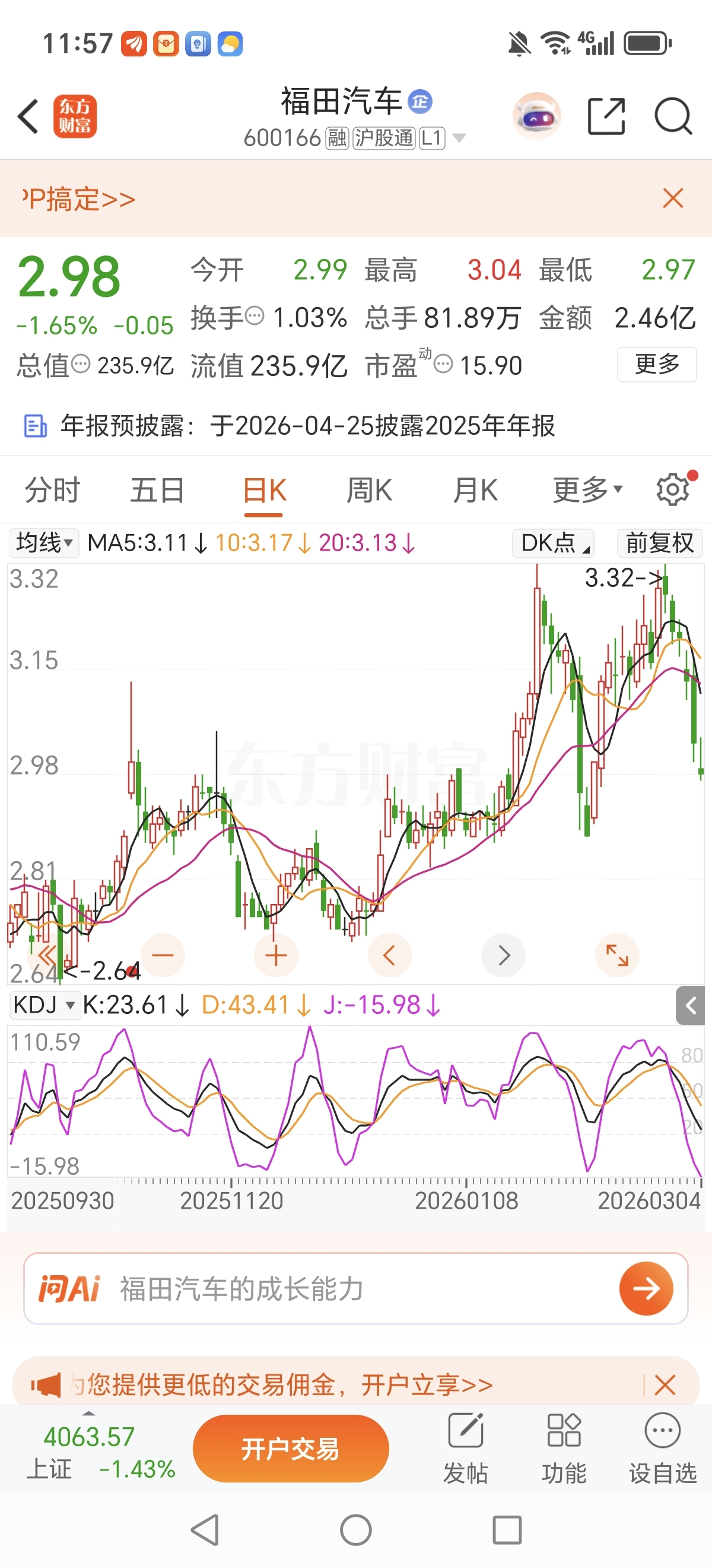 $福田汽车(SH600166)$ J值—15.98