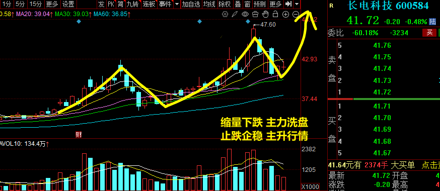 长电是世界第三,中国大陆第一的芯片封测龙头,目前整体走的是上升趋势,属于第三浪行情的启动阶段。前期缩量洗盘调整下来之后,周四底部收出了十字星向上变盘的信号,如果今天10:30能放量,并且股价站稳五日和十日均线,我会在这里上车,大家今天上午在看盘的过程中,一定要观察长电在开盘后1个小时的量价关系,今天很可能三浪的启动点会出现。
