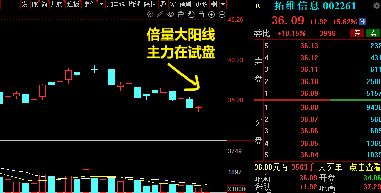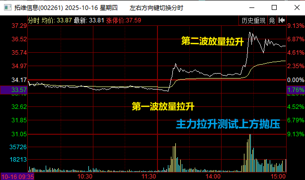 拓维经过了前期的调整之后,主俚已经完成了洗盘和西筹,昨天周四放出倍量大阳线,丛分时图连续两轮的强势拉升可以看出来主俚在试盘,这是一个非常标准的试盘线,今天如果集合竞价量能爆量,能出现高开,9:30开盘就是我们的上车点,开盘前,我也会在留言区及时和大家讲拓维有没有机会上车。
