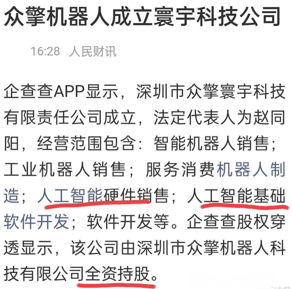 凤凰新闻:众擎机器人成立寰宇科技公司,联美控股为众擎机器人第四大股东,持股10.