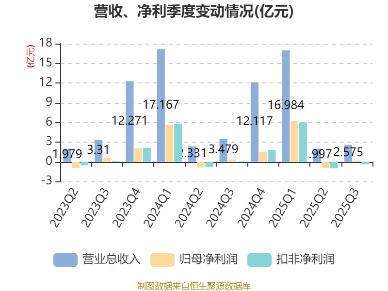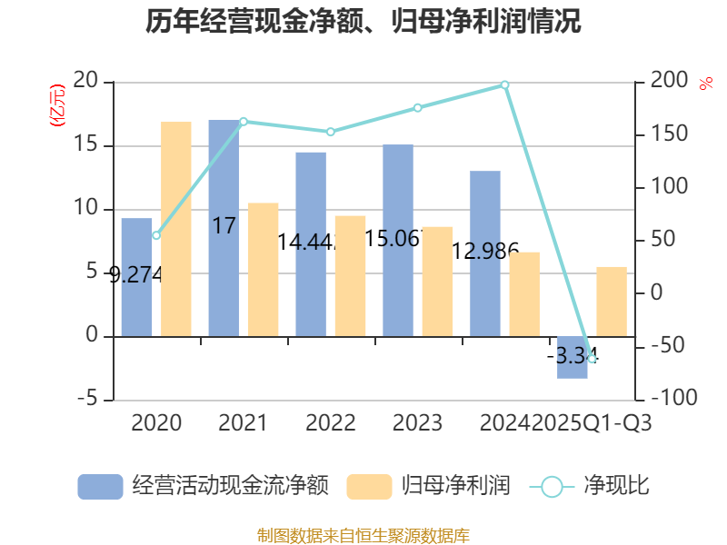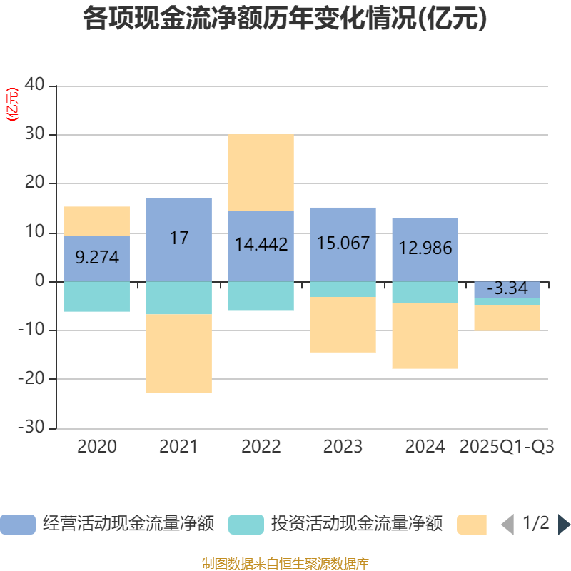 2025年前三季度,公司经营活动现金流净额为-3.34亿元,同比减少3888.77万元;筹资活动现金流净额-5.2亿元,同比增加3.64亿元;投资活动现金流净额-1.57亿元,上年同期为-1.2亿元。