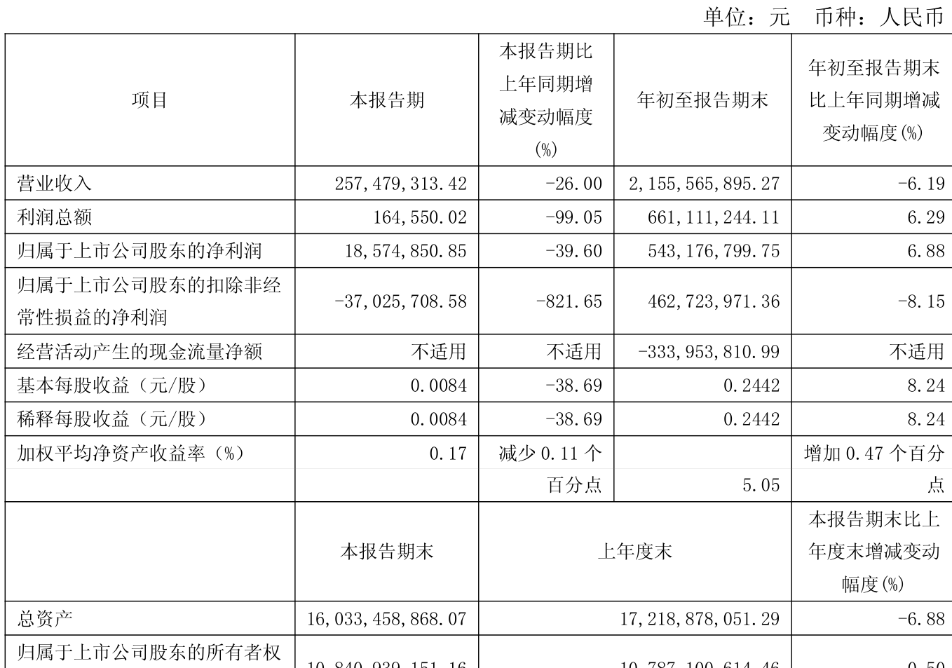 中证智能财讯联美控股(600167)10月31日披露2025年第三季度报告。前三季度公司实现营业总收入21.56亿元,同比下降6.19%;归母净利润5.43亿元,同比增长6.88%;扣非净利润4.63亿元,同比下降8.15%;经营活动产生的现金流量净额为-3.34亿元,上年同期为-2.95亿元;报告期内,联美控股基本每股收益为0.2442元,加权平均净资产收益率为5.05%。